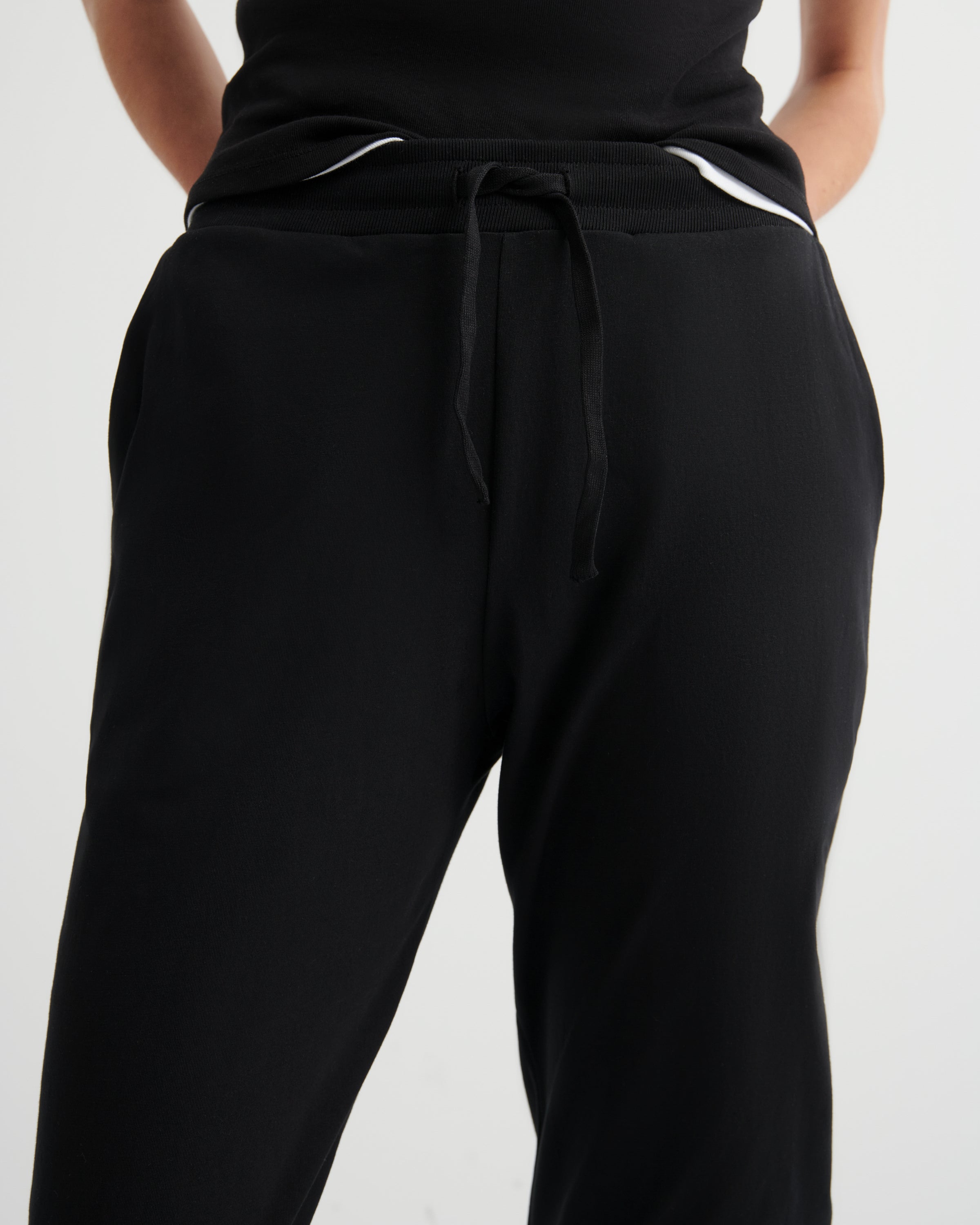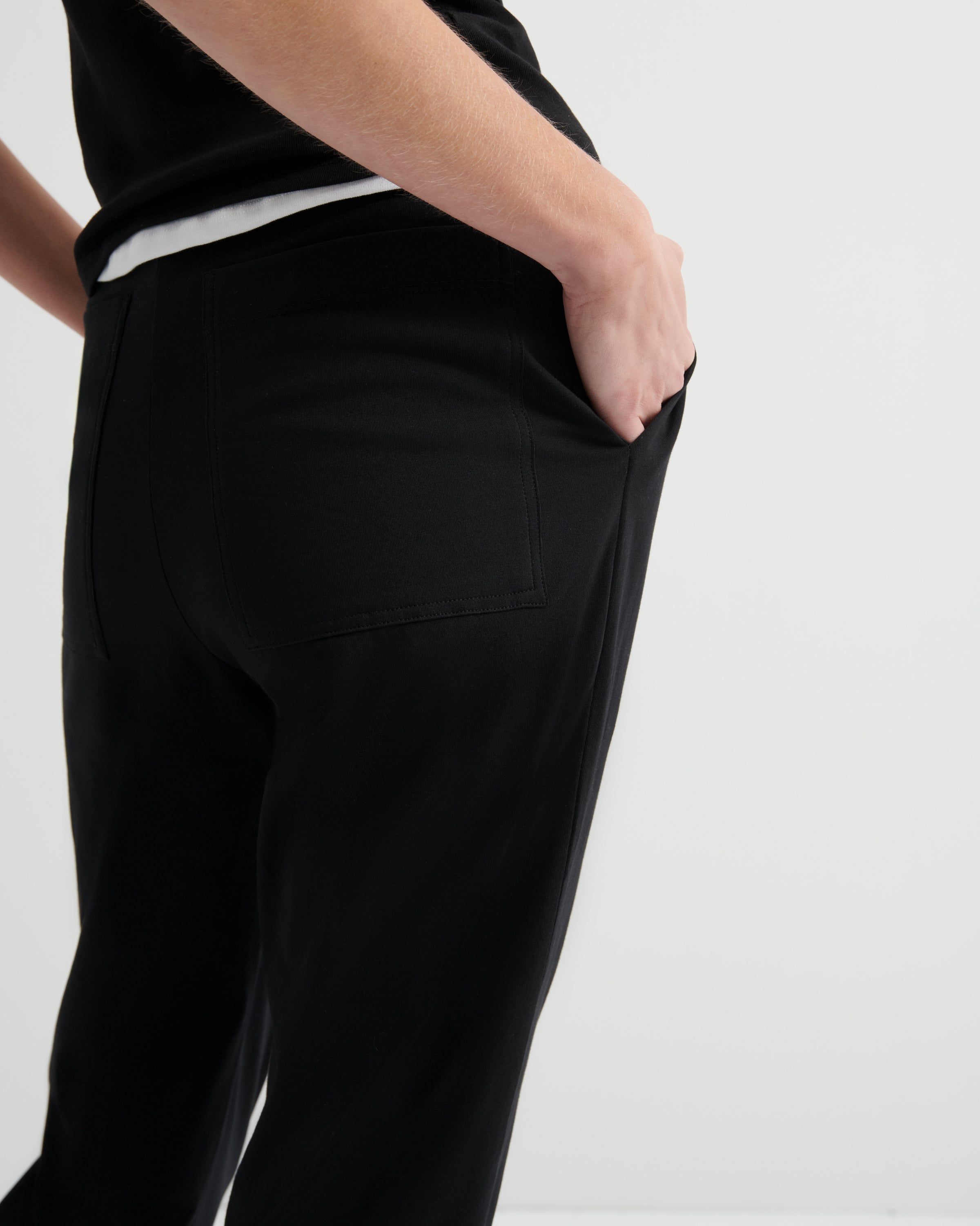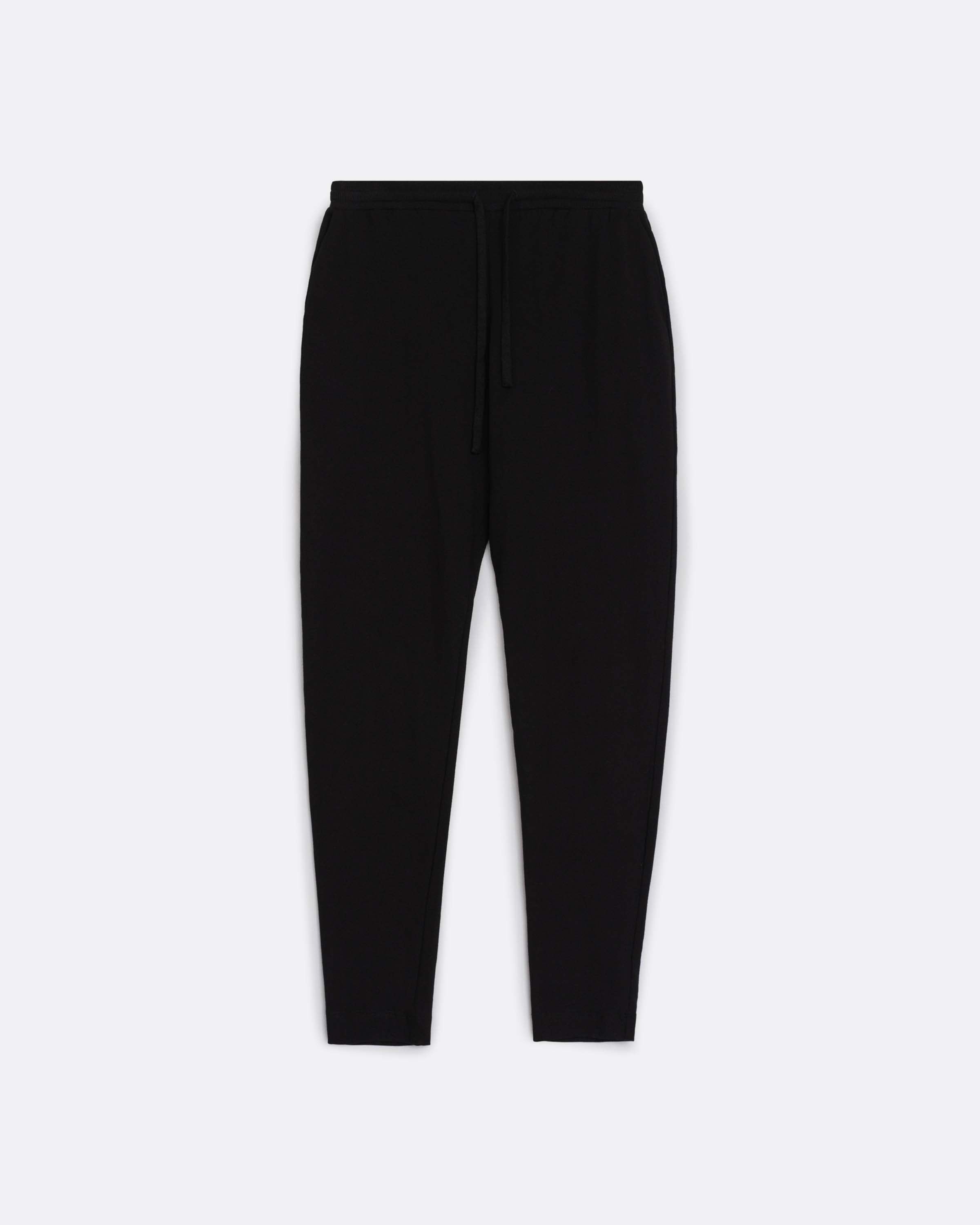 A casual slim-fit pant with a tapered leg crafted from mid-weight organic cotton jersey. Side and back pockets add practicality, while an elastic waistband and functional drawcord ensure a comfortable, customisable fit.