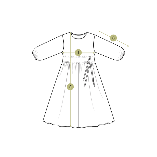 The Aspen Dress is a full-length style with a relaxed fit, in-seam pockets and full a-line skirt. It has a drop shoulder with a sculptural bell sleeve with elastic through the cuff. It features a double drawcord waist detail for customisable wear. Made in organic cotton woven in our Forest Grid.