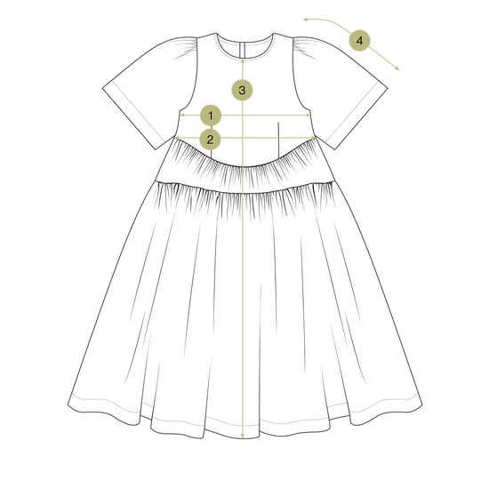 Dress 05 features our archival Garden Book and Hazy Floral prints in organic cotton poplin. It has a full, two tiered gathered skirt with inseam pockets and ends at mid-length. It has puff sleeves and its finished with a key-hole closure with a shell button at the back neck. The dress has a close fit across the bust, and we recommend sizing up 1-2 size in this style for a more comfortable fit.