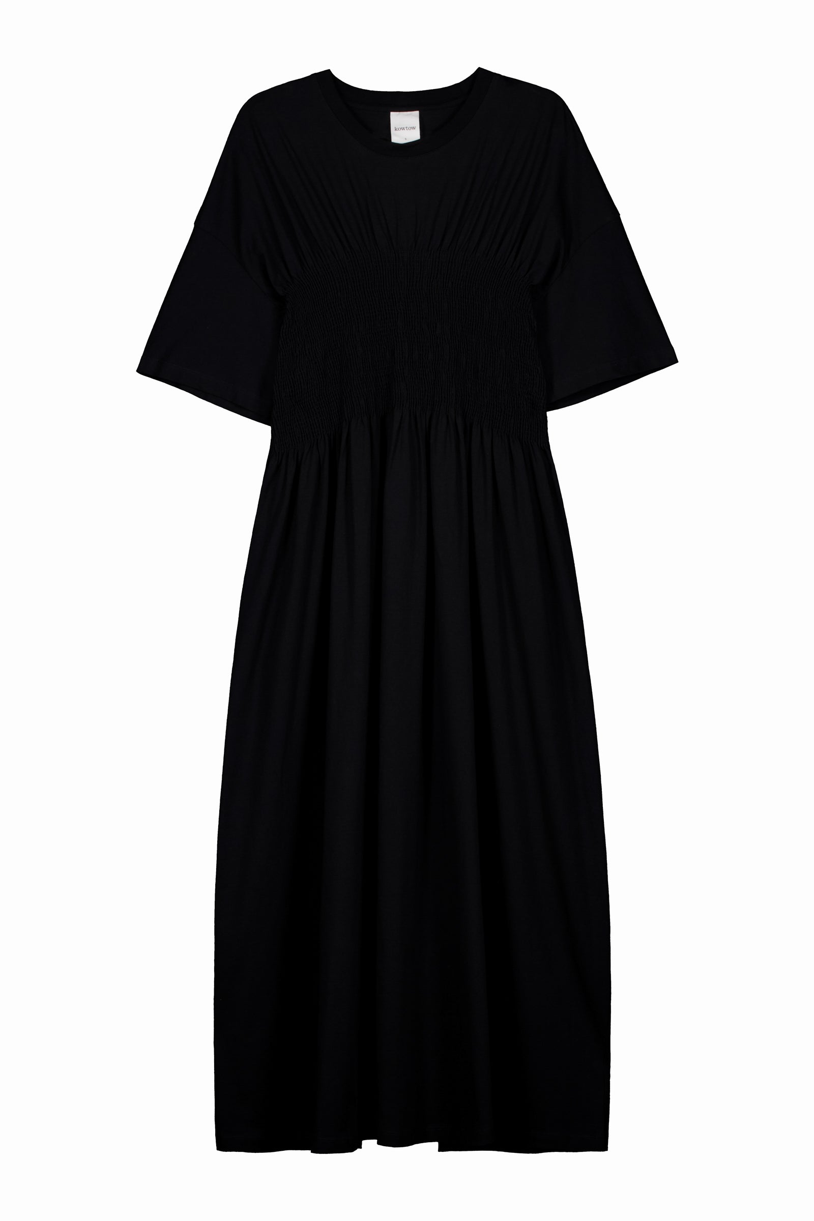 Effortlessly elegant, the Gathered Dress combines comfort with thoughtful design. Its relaxed fit, enhanced by intricate shirred detailing through the bodice, creates a flattering shape. The dress falls to ankle-length and features drop shoulder sleeves. Made in a midweight organic cotton jersey.
