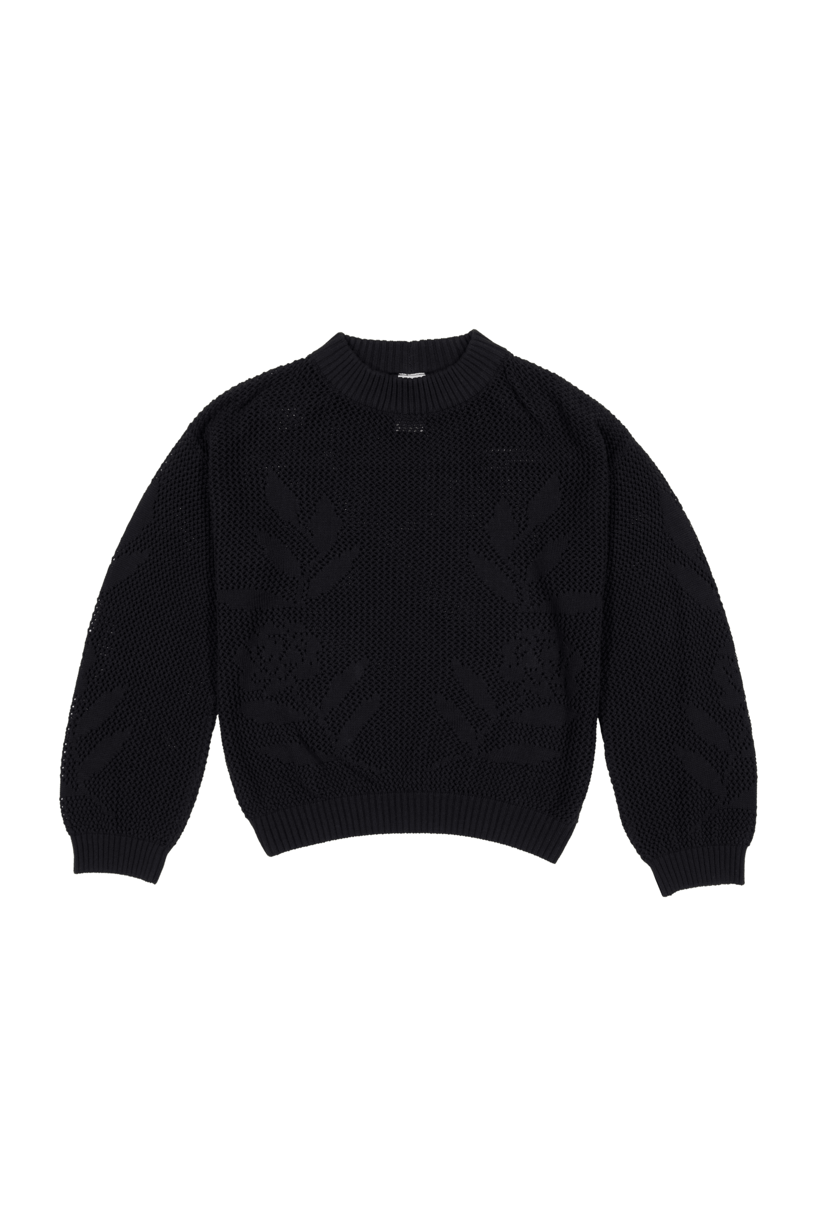 Our Amalie Crew is knitted in an open crochet stitch, and detailed with mirrored floral motifs through the front and on each sleeve. It has a relaxed fit through the body, and is finished with a traditional crew neckline. The sheer nature of this style allows for multiple layering options.