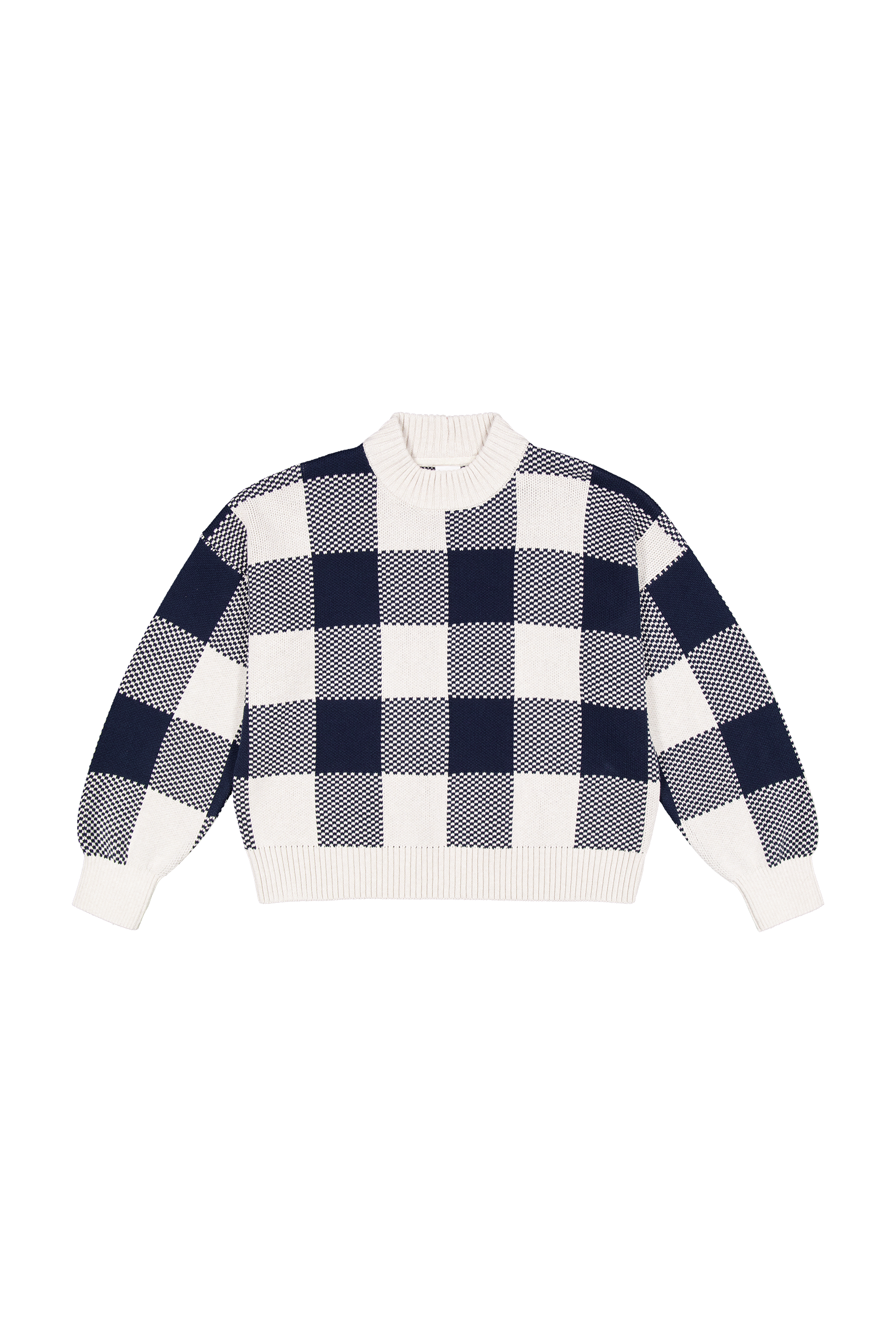 A crew neck jumper featuring a bold navy and grey check pattern. Knit in organic cotton in a jacquard stitch, the Otti Jumper has an oversized fit and drop shoulders.