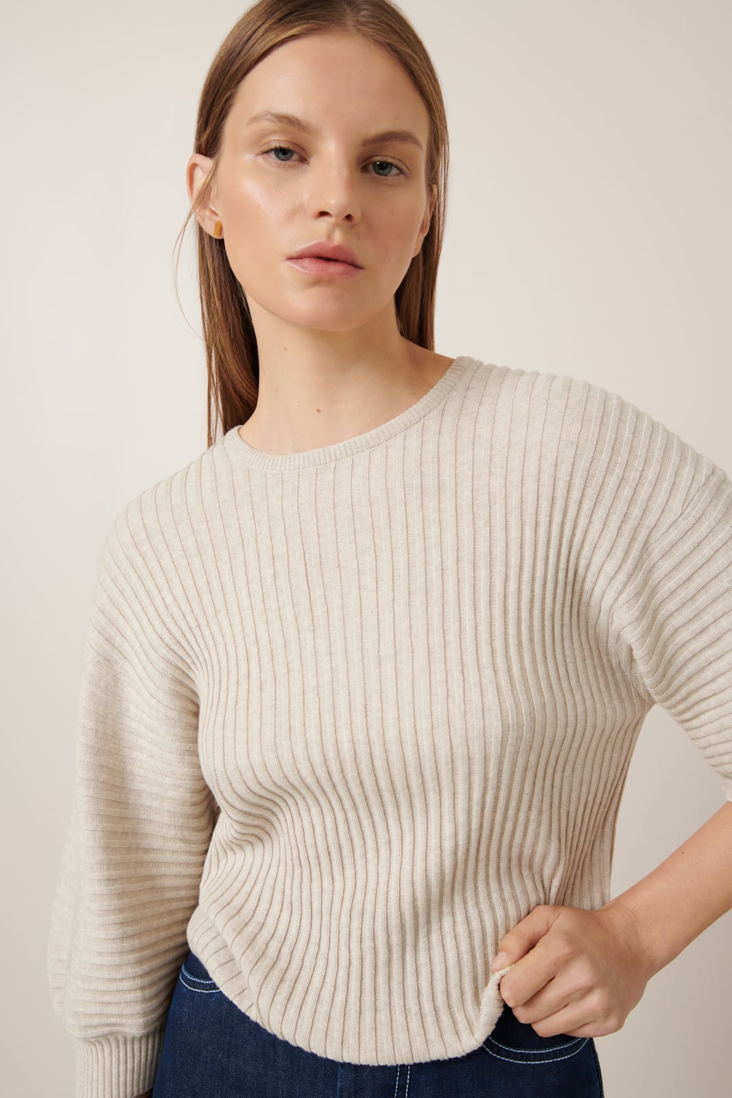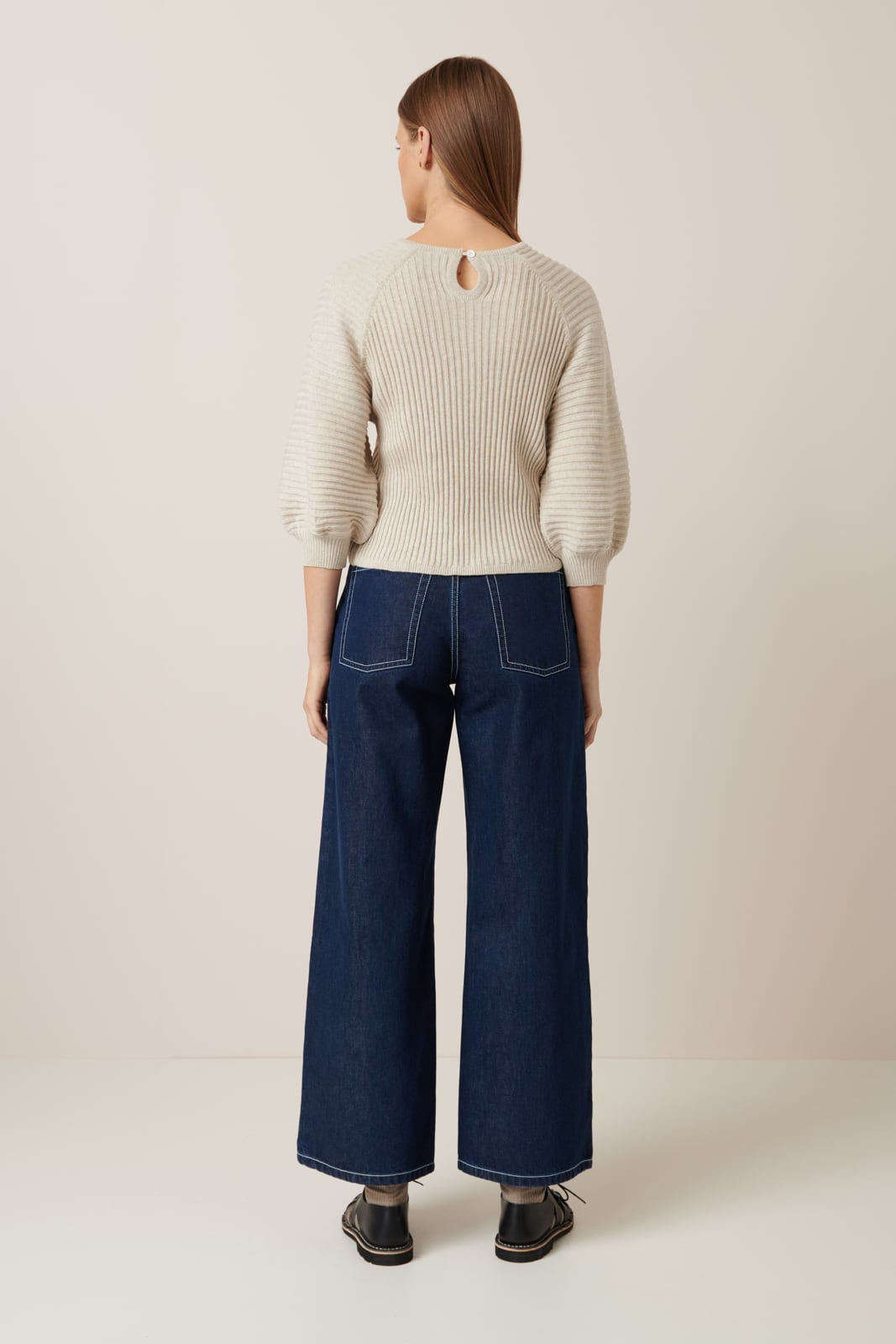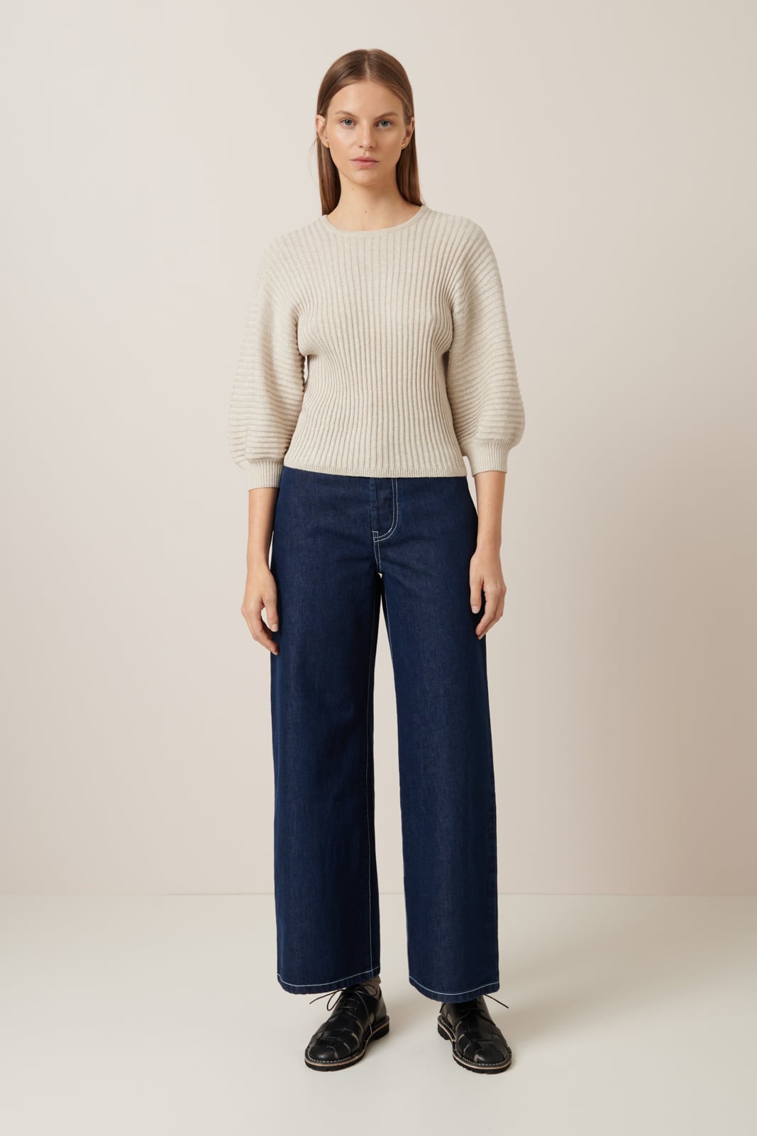 Made from organic cotton woven in a fine rib knit, the Quinn Top is a beautifully soft style that is elegant and easy-wear. It features subtle balloon sleeves with contrast rib at the cuff. It has a standard fit with a cropped length, and fastens at the back with a Mussel shell button.