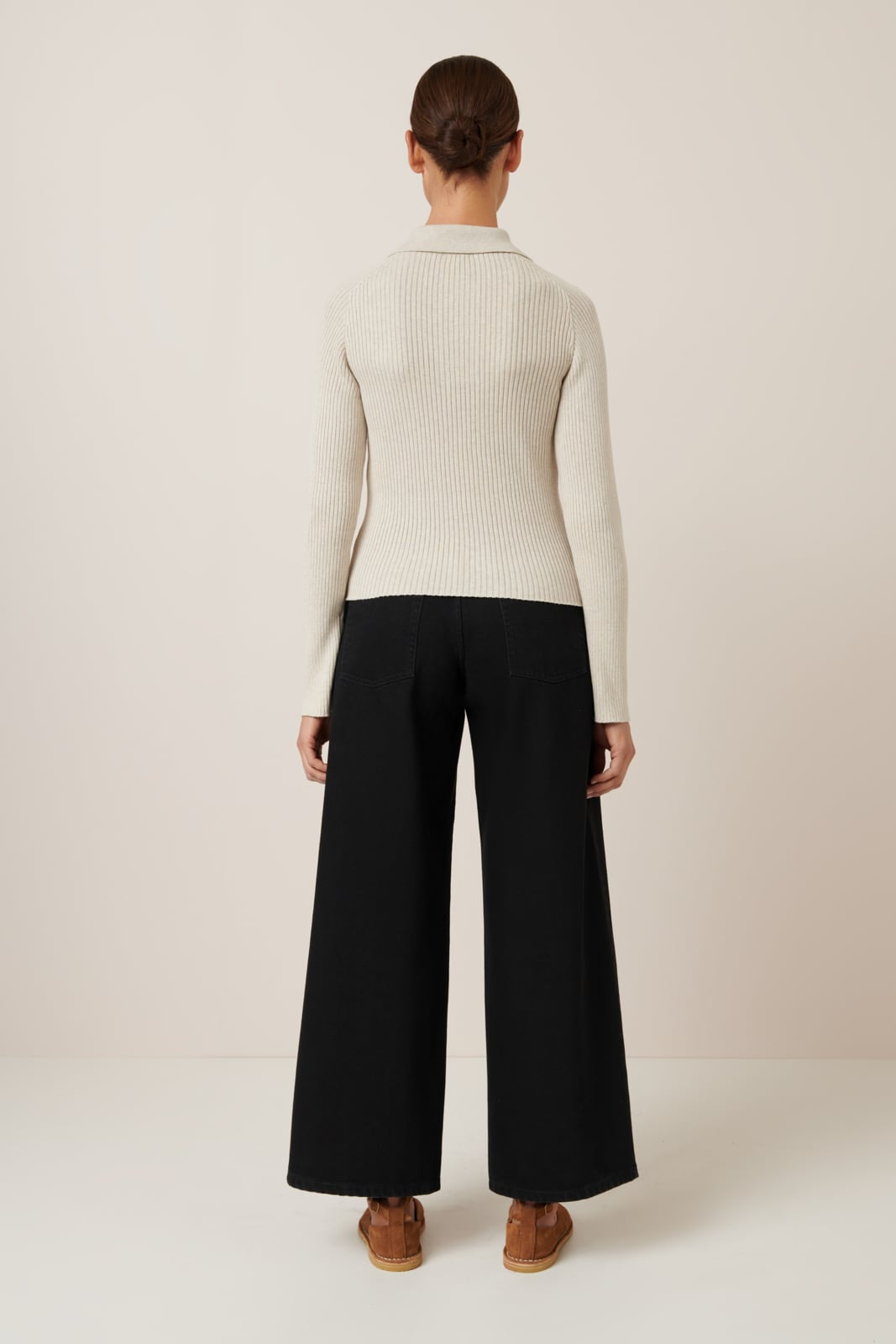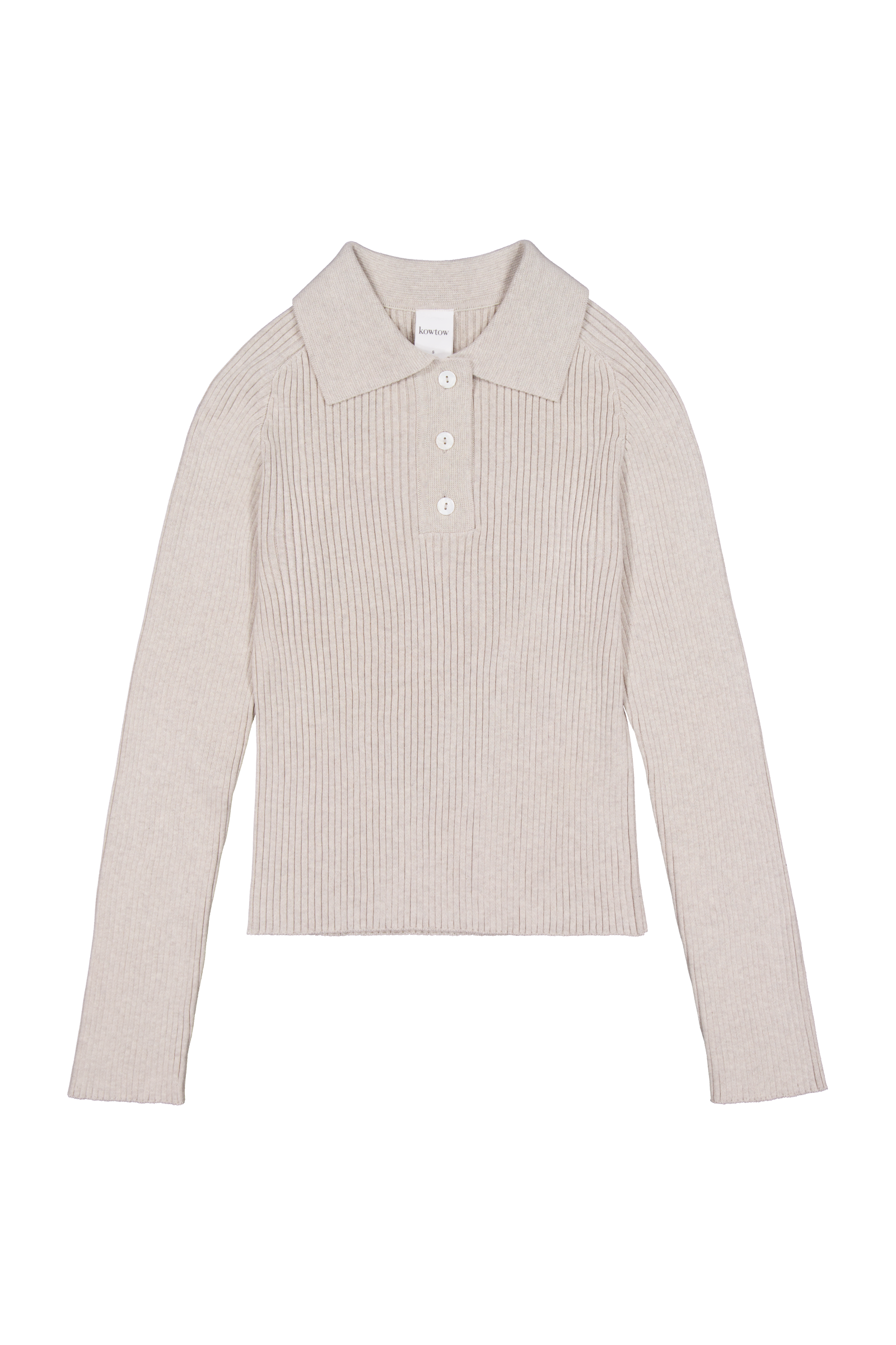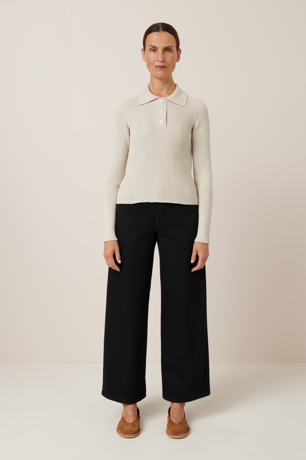 A polo inspired top, the Ridge Top is knit in a fine stretch rib that offers an easy wear and close fitting look. Knit in a soft organic cotton in our Oat Melange colourway, it has raglan sleeves, a collar and is detailed with functional Agoya shell buttons.