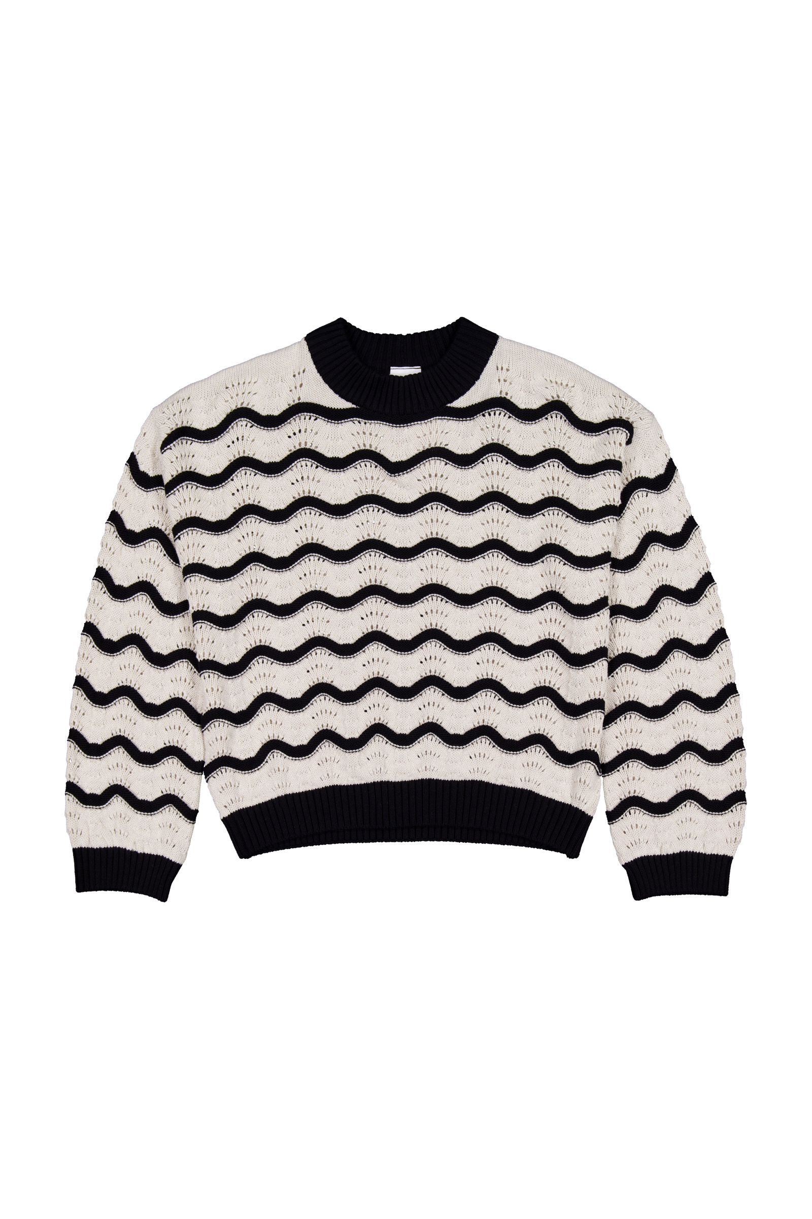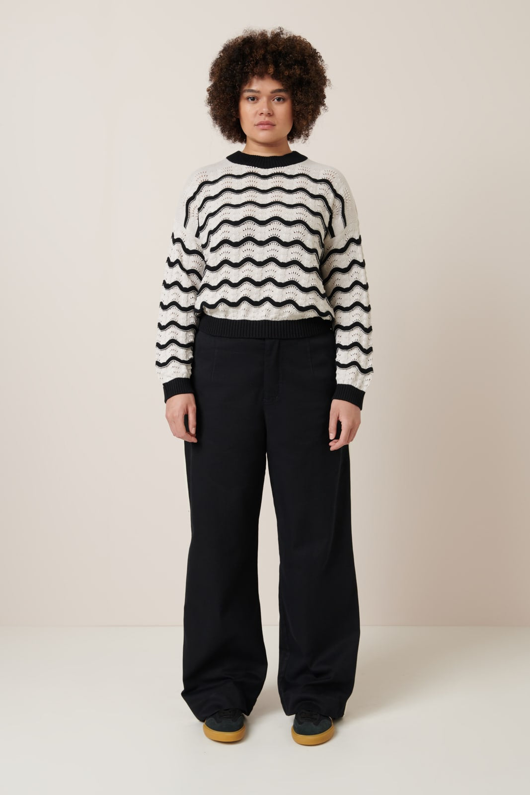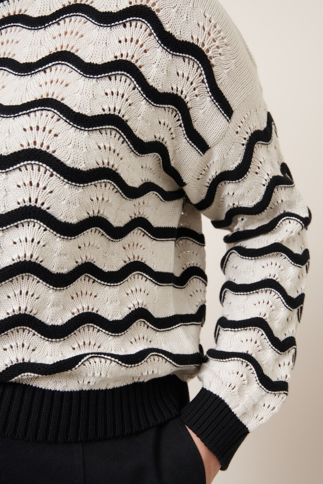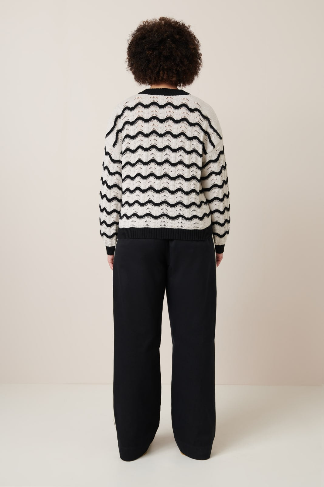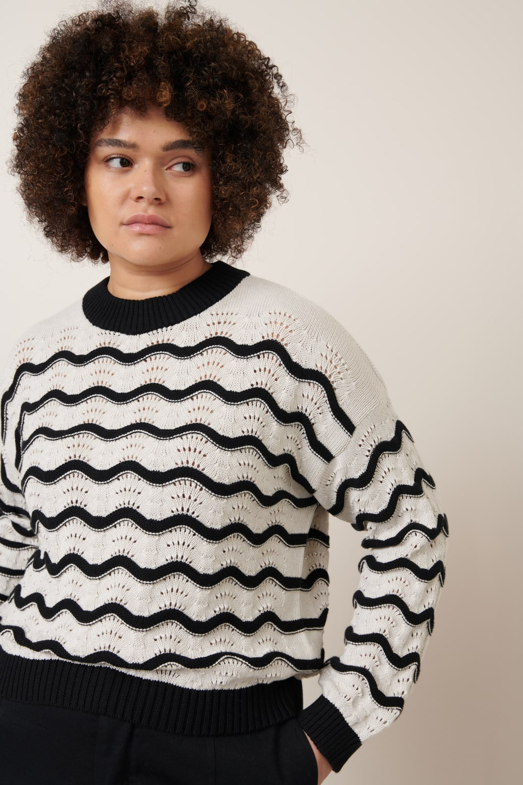 A playful monochromatic knit, made from organic cotton knitted in our new wave lace stitch. The Tide Jumper features a graphic wave pattern and open stitch, adding both pattern and texture to your wardrobe. It has a standard fit with dropped shoulders and a full sleeve, and features contrast rib at the neck, cuff and hem.