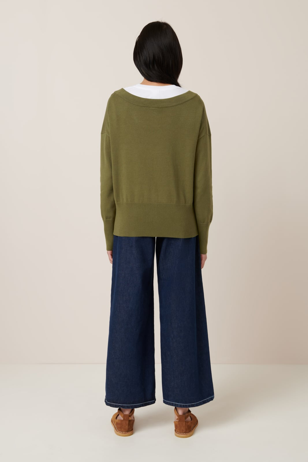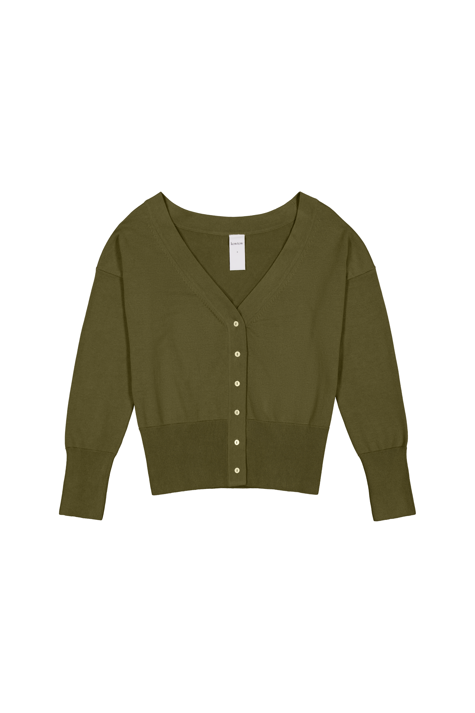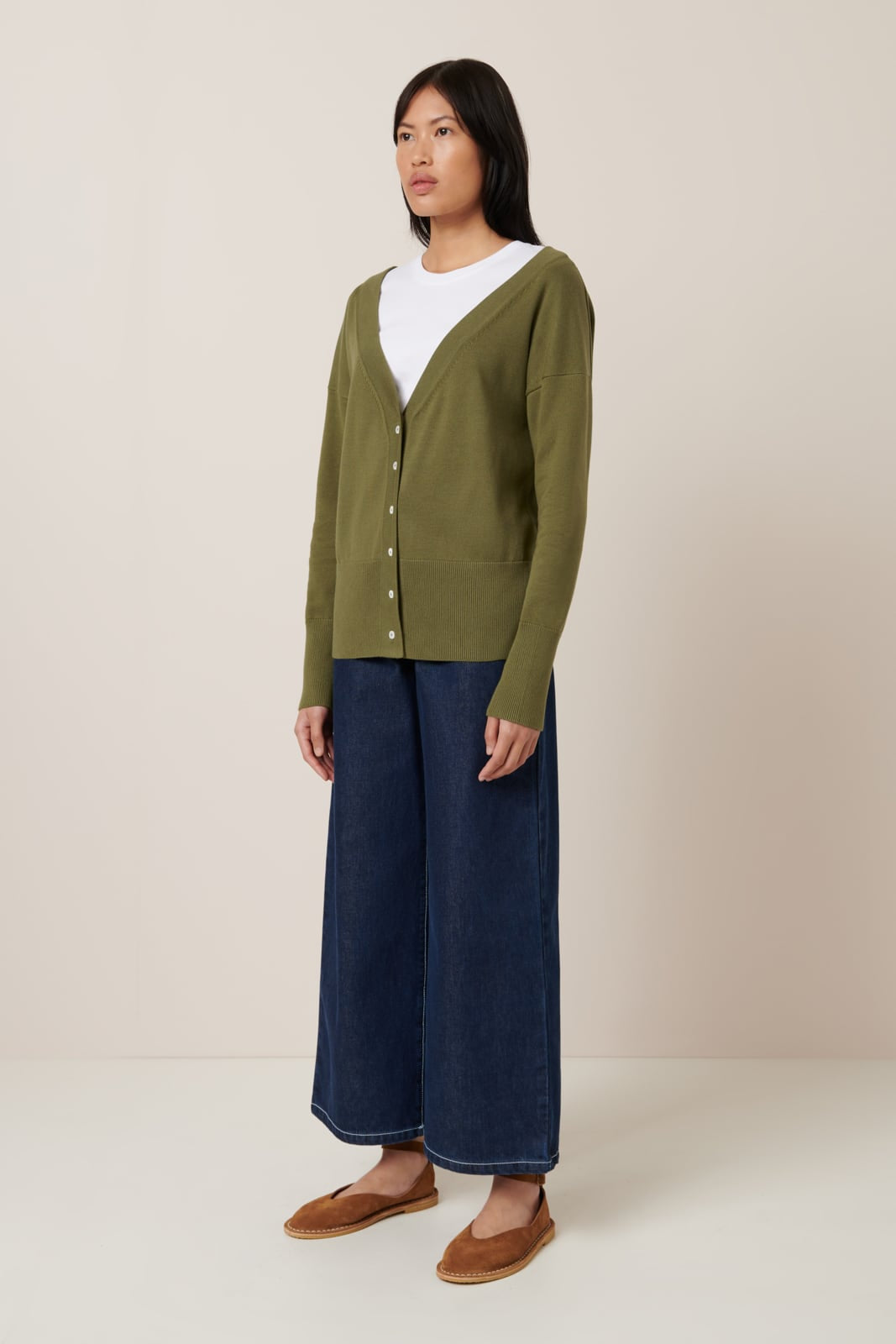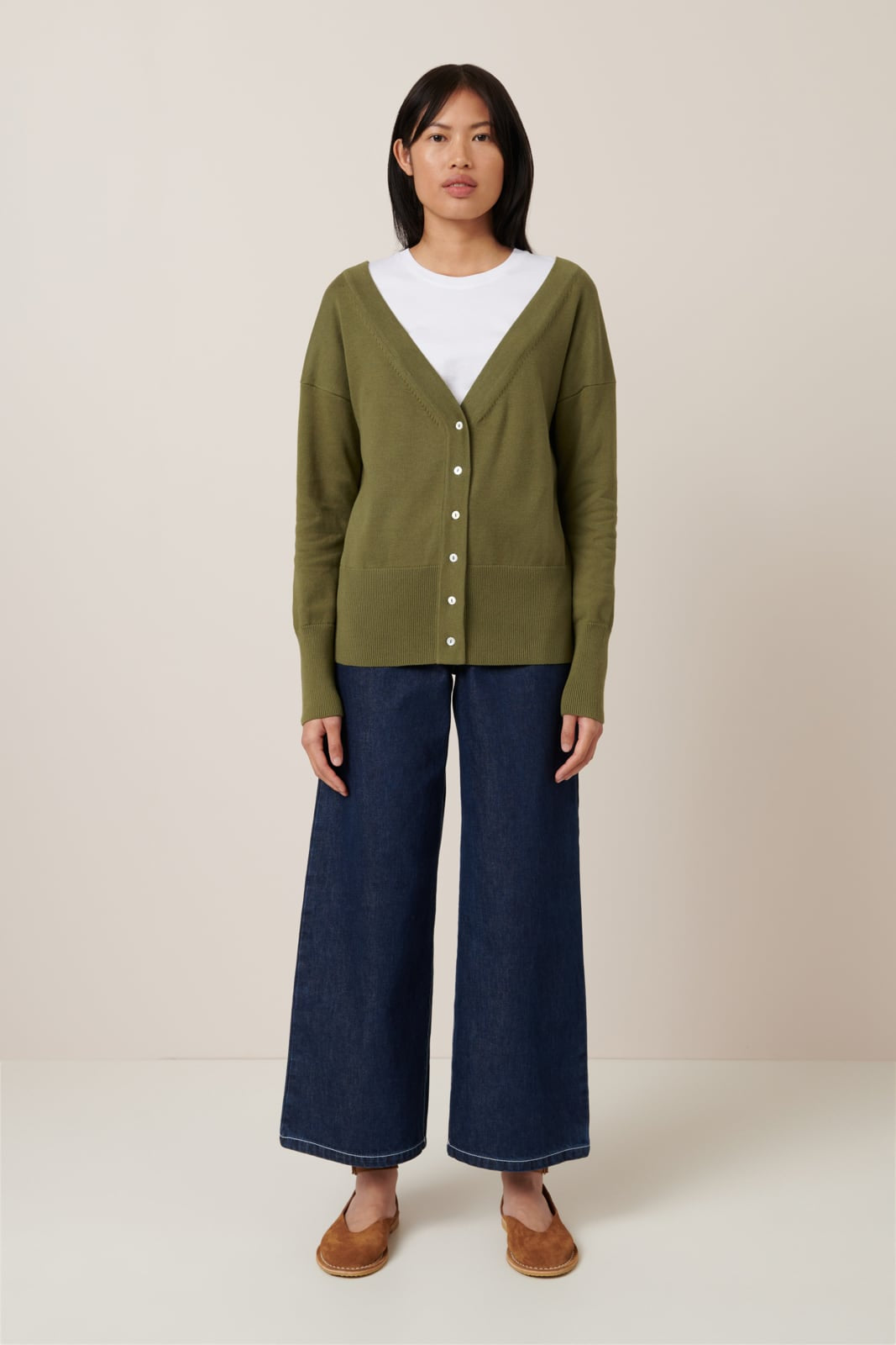 An elevated, lightweight style made in organic cotton and knitted in a fine single jersey stitch in our Caper colourway. The Willow Cardigan has a relaxed fit, flattering deep V neckline with a wide rib at the cuffs and hem. It has a drop shoulder and is fastened through the front with delicate Agoya shell buttons. Can be worn as a top or unbuttoned as a light layer.