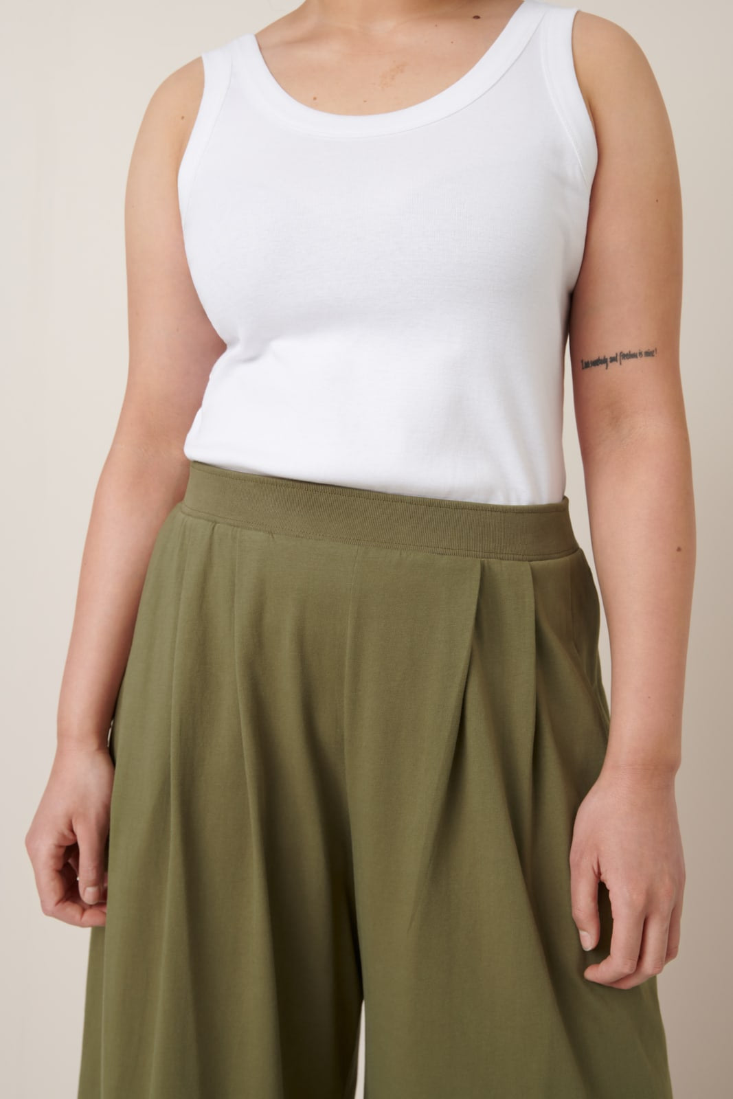 Our best-selling style, the Drape Pant, is a full-length, wide-leg pant that features elegant front pleats and is finished with a wide, ribbed elastic waistband and convenient side seam pockets. Made from midweight organic cotton, the Drape Pant offers both comfort and sophistication.