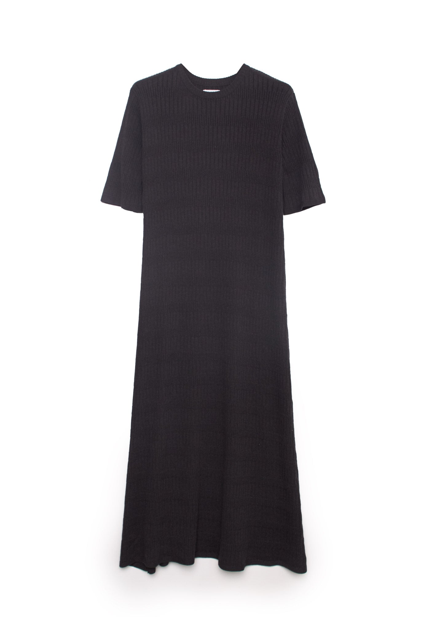 A long a-line dress knitted in an alternating rib pattern. The dress features mid-length sleeves and is finished with narrow rib at the neckline.