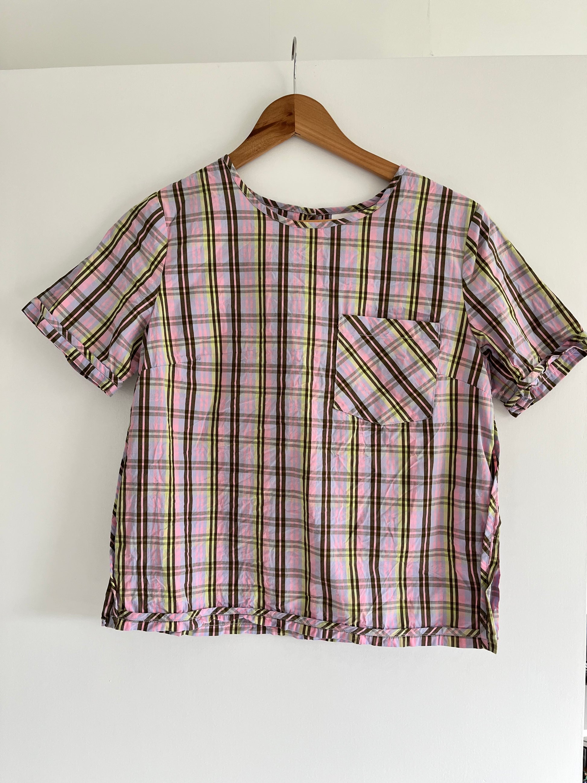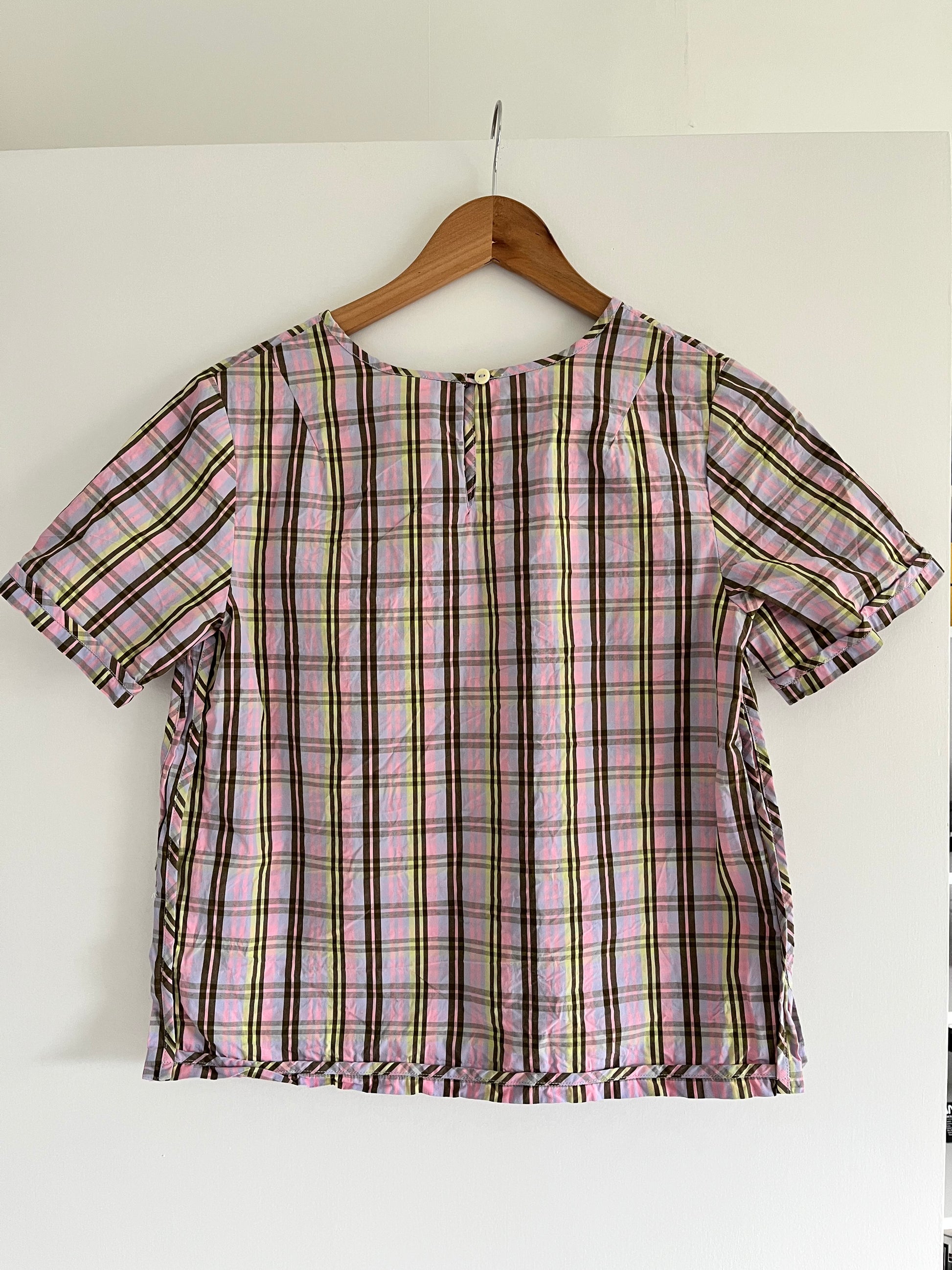 The Adrian Top has a standard fit with bust darts for gentle shaping and side splits for ease of wear. It features a binding detail at the cuffs and hem, and fastens with a button and loop at the back.
