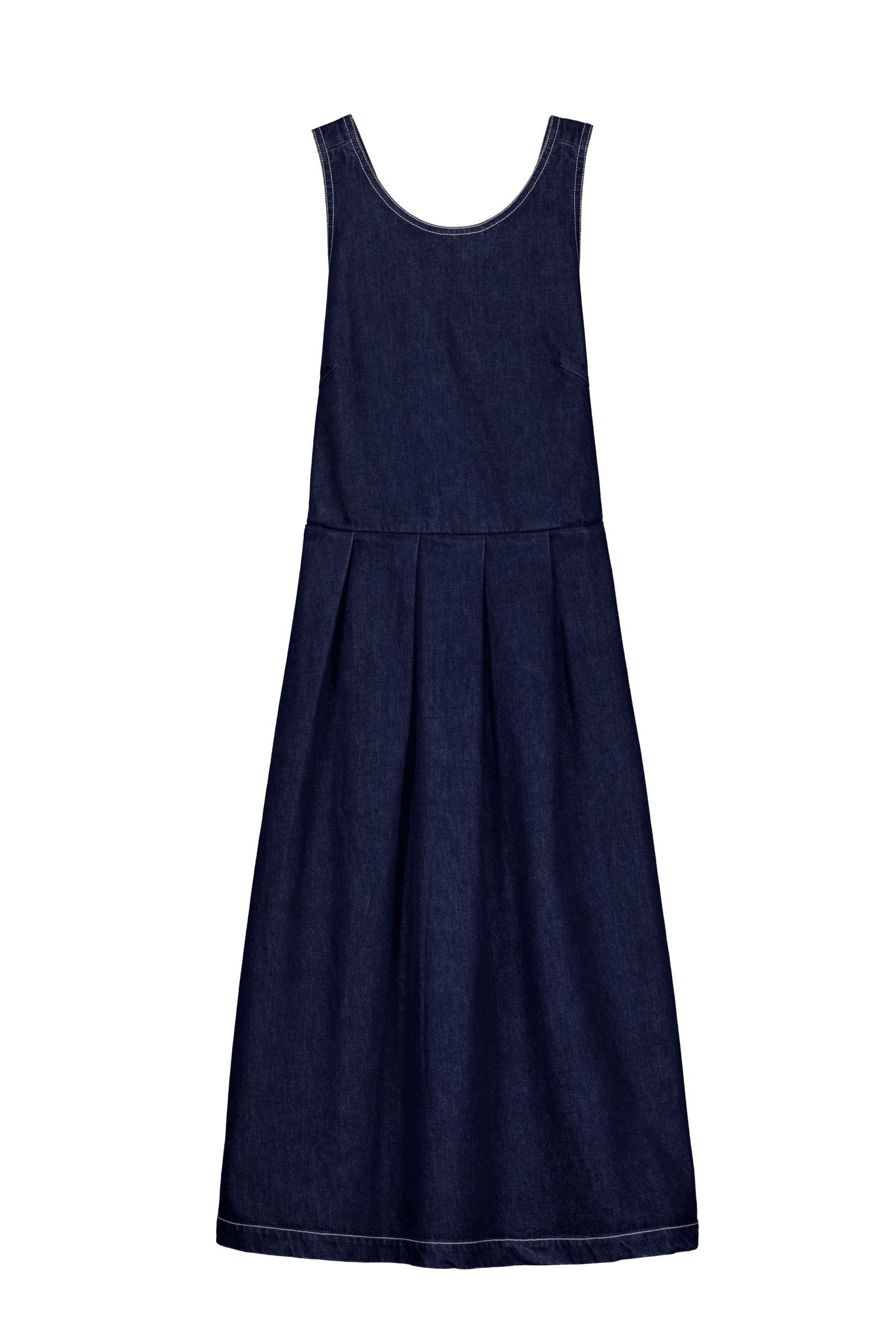 An apron style dress with a pleated skirt and a cross over back, made from heavyweight organic cotton denim. It features side seam pockets, and fastens at the side waist with nut buttons. A versatile dress with a standard fit that can be worn on its own, or layered over your favourite shirt or tee.
