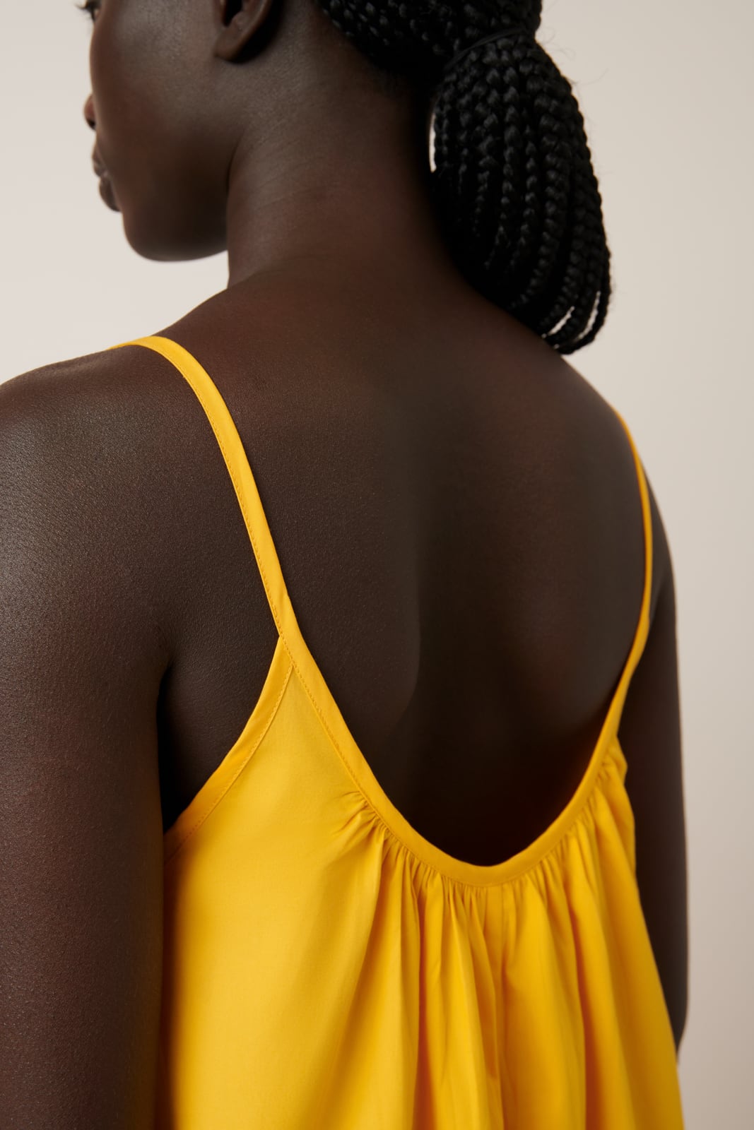 An airy summer dress, made using archival organic cotton poplin in our bold sun yellow. A relaxed style that features in-seam pockets and falls to ankle length. Detailed with a gathered neckline and delicate straps, it can be styled on its own or with a tee layered underneath.