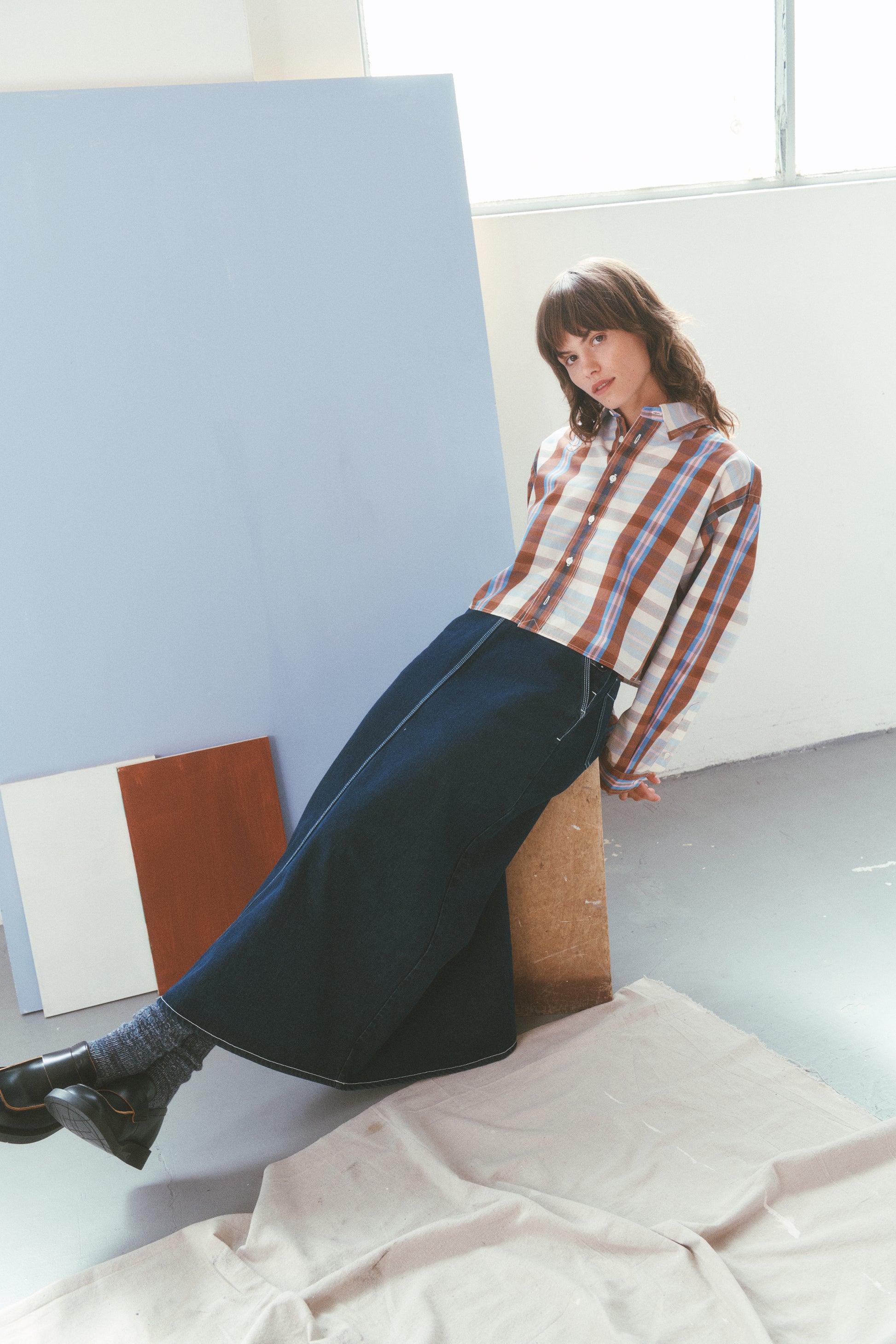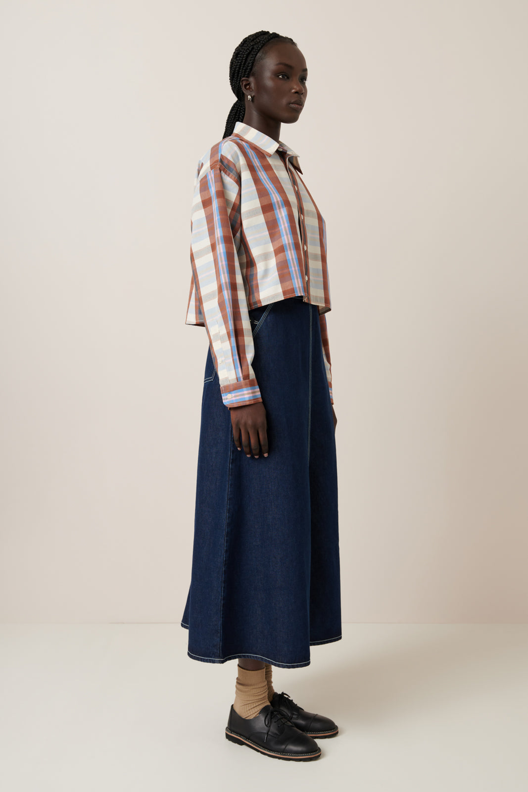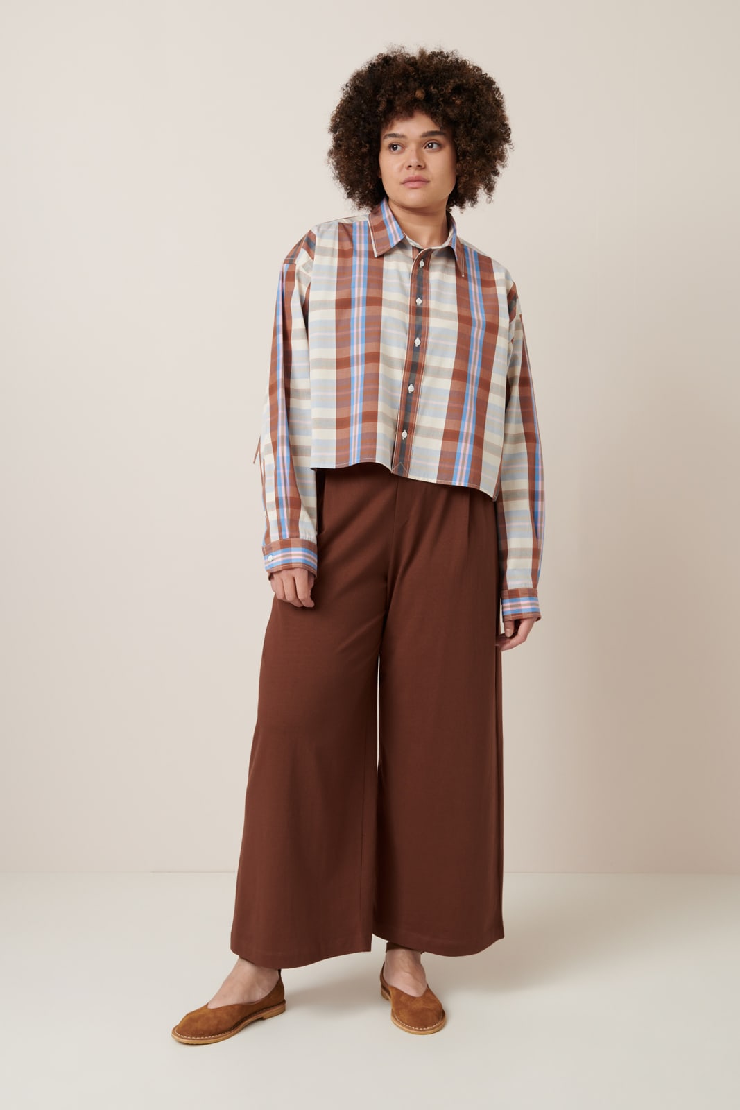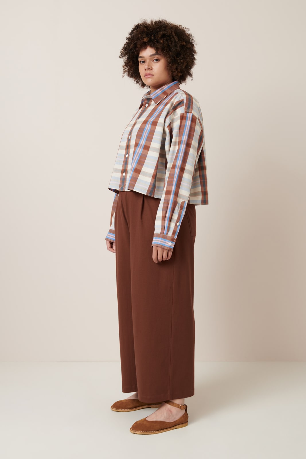 A modern twist on a classic silhouette, the Lauren Shirt is a boxy, cropped style with a relaxed fit. Featuring a classic shirt collar, pleated cuffs and finished with nut buttons. Style with tailored trousers for a polished look or with denim for a casual outfit. Made from organic cotton in our playful Terra Check poplin.