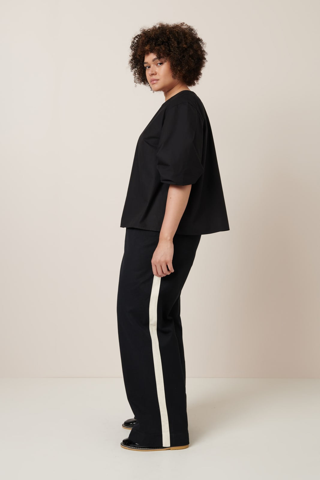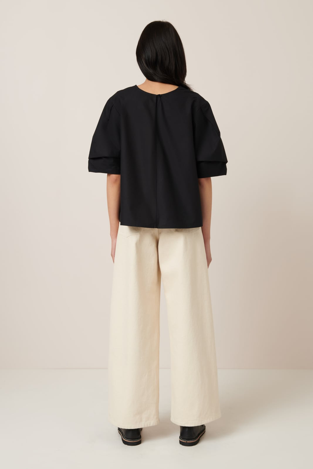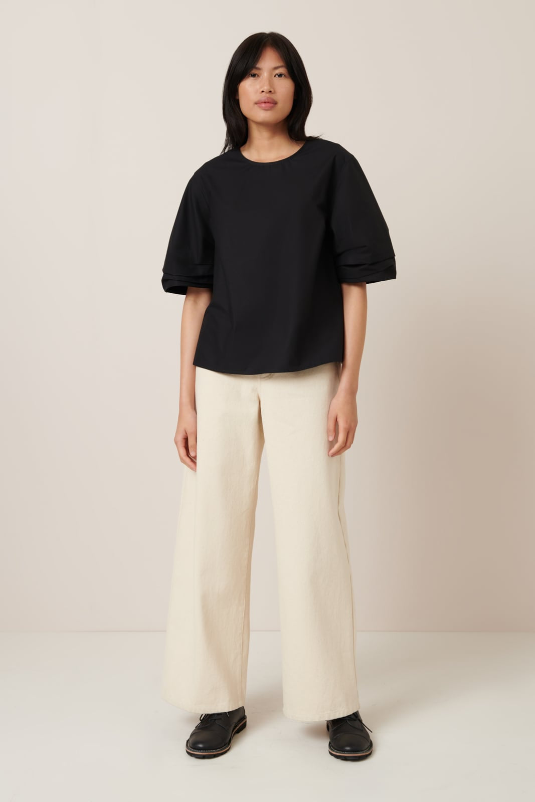 A simple yet statement piece, the Mila Top has a relaxed fit and features a sculptural sleeve, shaped with unique pleating underneath and on top of the sleeve. It has bust darts, falling to a comfortable a-line shape through the body. Made from organic cotton poplin, it is finished with a Mussel shell button closure at the back neck.