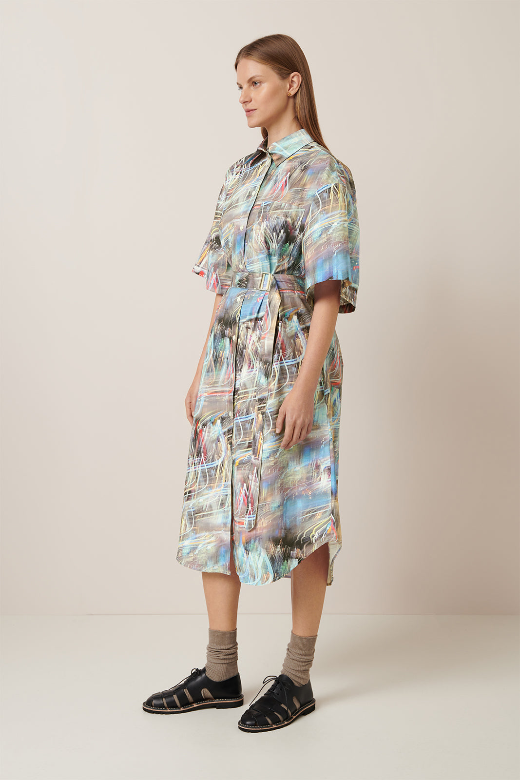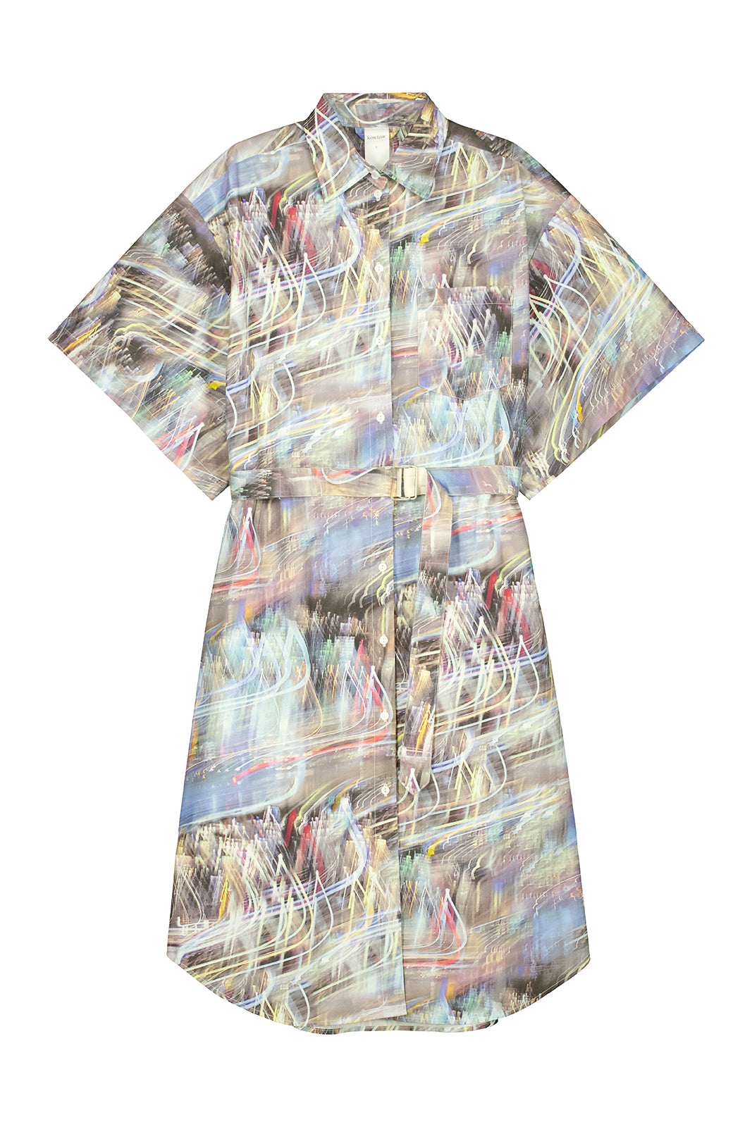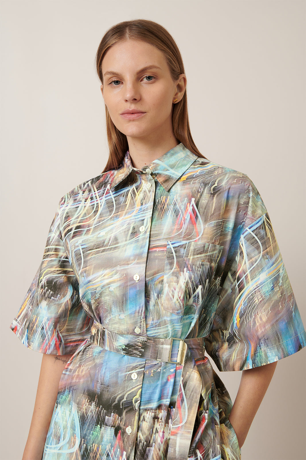 The perfect statement shirt dress, made from organic cotton poplin that is digitally printed in our Cityscape print, capturing the city's energy at night. The Neon Dress is a mid-length, oversized shirt dress which can be worn loose or cinched at the waist with the detachable belt. It features inseam pockets, standard collar and placket finished with Agoya shell buttons. The exaggerated wide sleeves and curved hem create a unique silhouette.