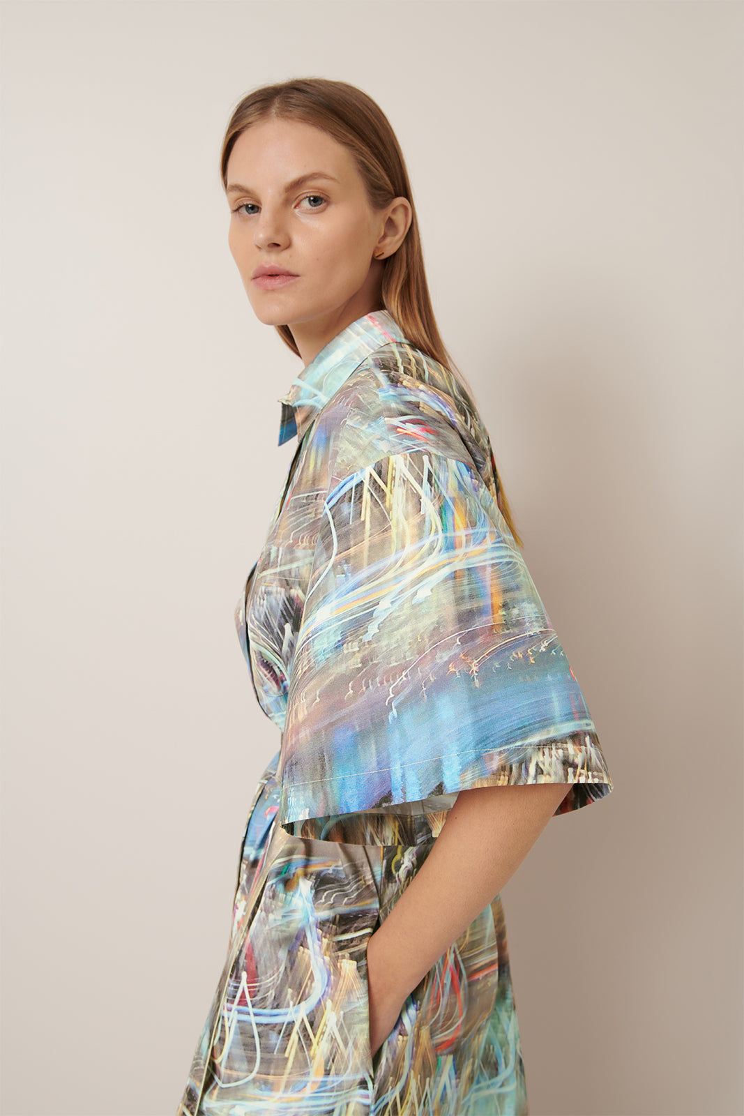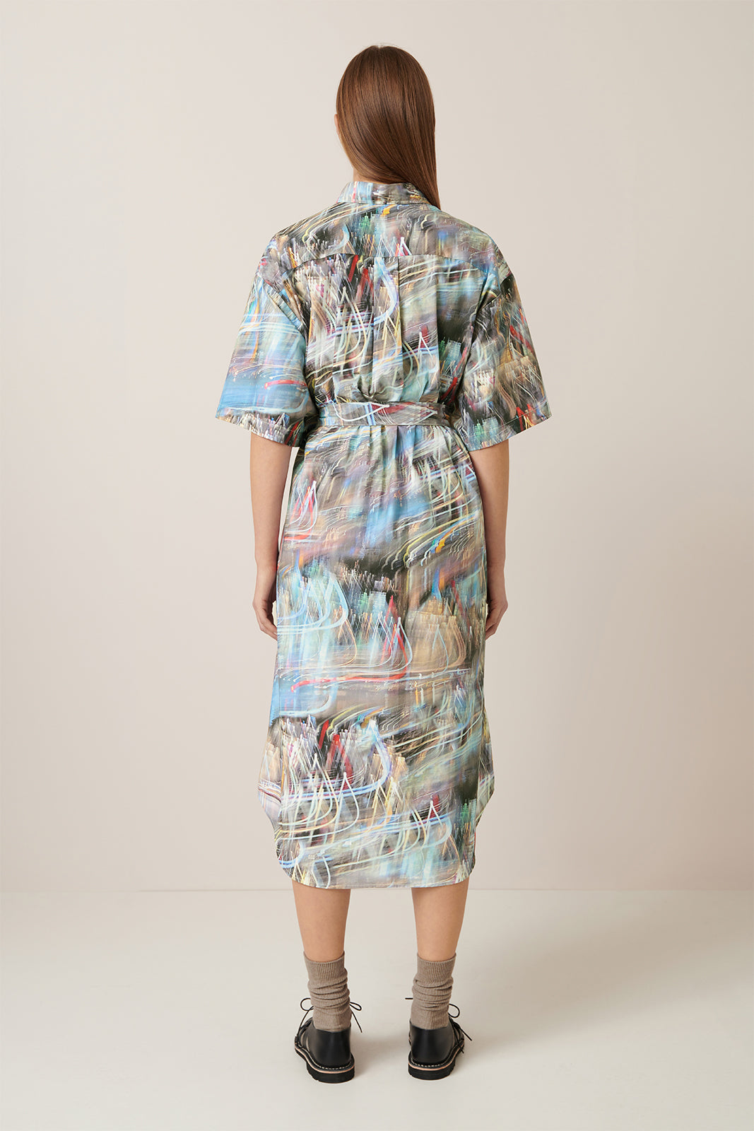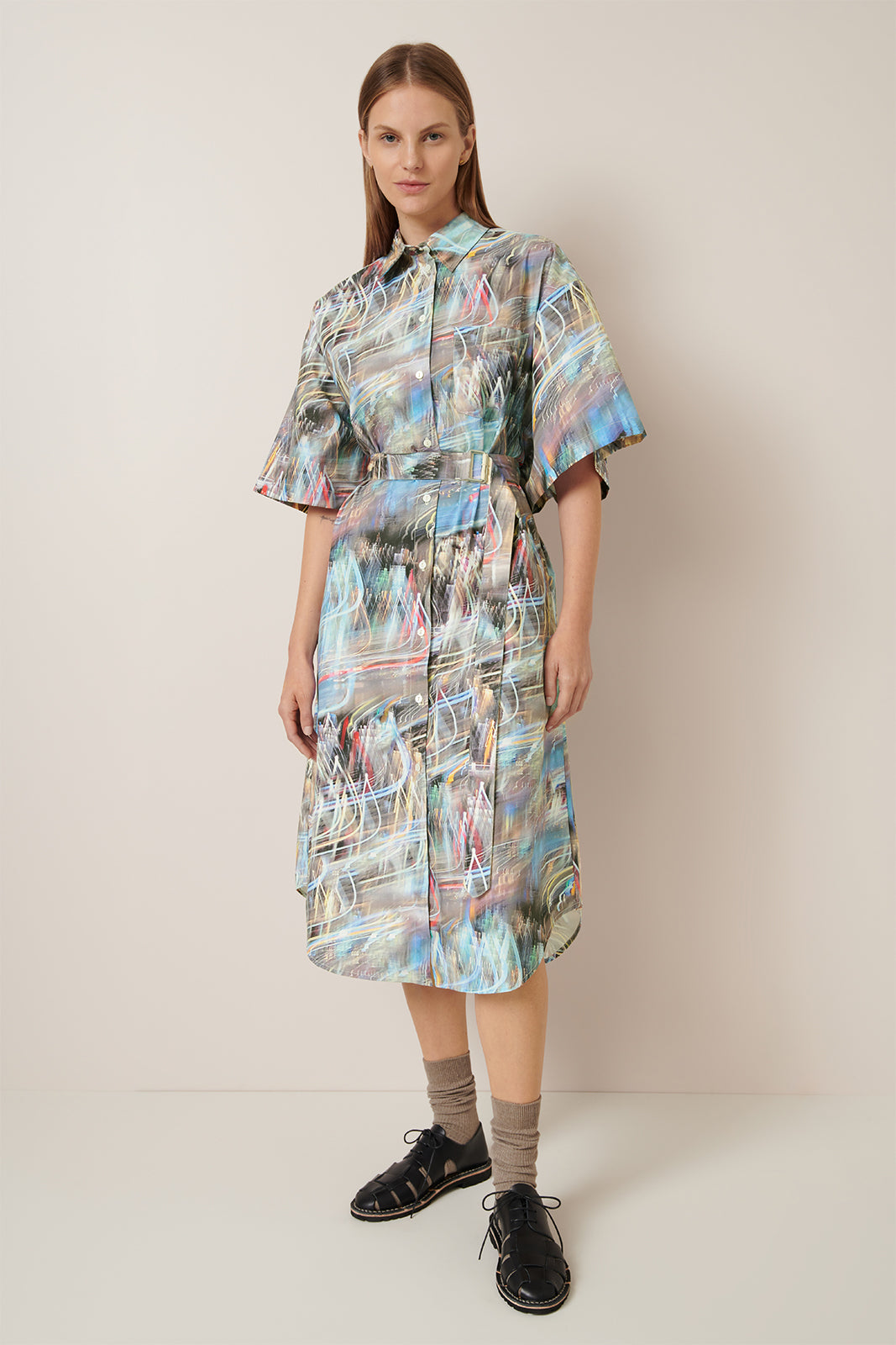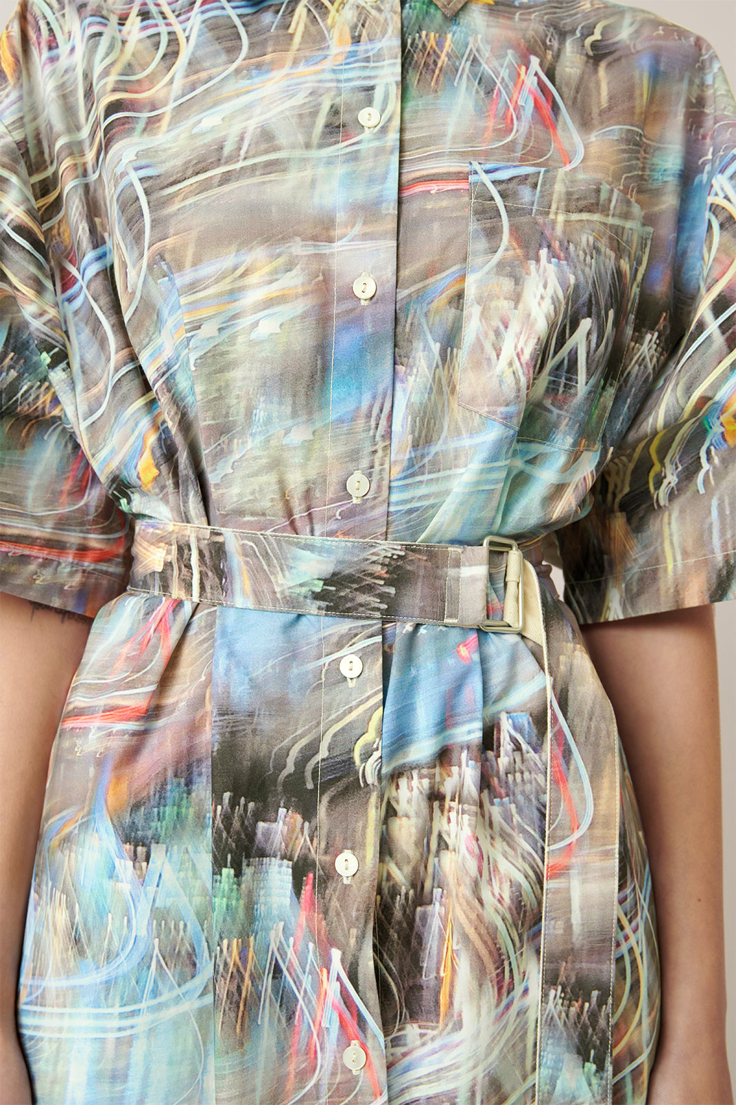 The perfect statement shirt dress, made from organic cotton poplin that is digitally printed in our Cityscape print, capturing the city's energy at night. The Neon Dress is a mid-length, oversized shirt dress which can be worn loose or cinched at the waist with the detachable belt. It features inseam pockets, standard collar and placket finished with Agoya shell buttons. The exaggerated wide sleeves and curved hem create a unique silhouette.