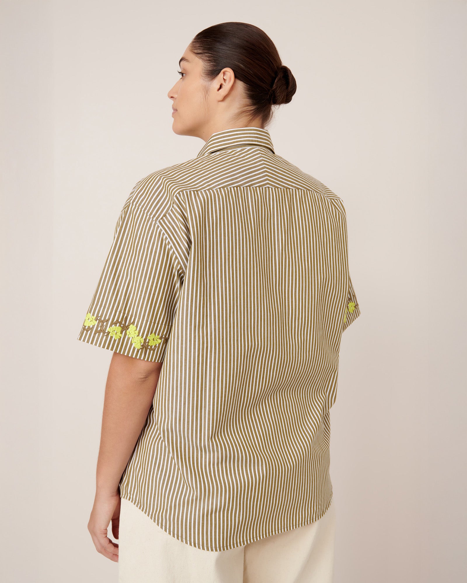 Delicately embroidered with cotton thread, the Wildflower Shirt showcases intricate floral motifs that soften its menswear-inspired silhouette. Crafted from crisp organic cotton poplin, it features a western-style yoke at the front and angled stripe detailing on the back yoke. Designed for a relaxed fit, the shirt fastens with nut buttons and pairs perfectly with the Wildflower Shorts.