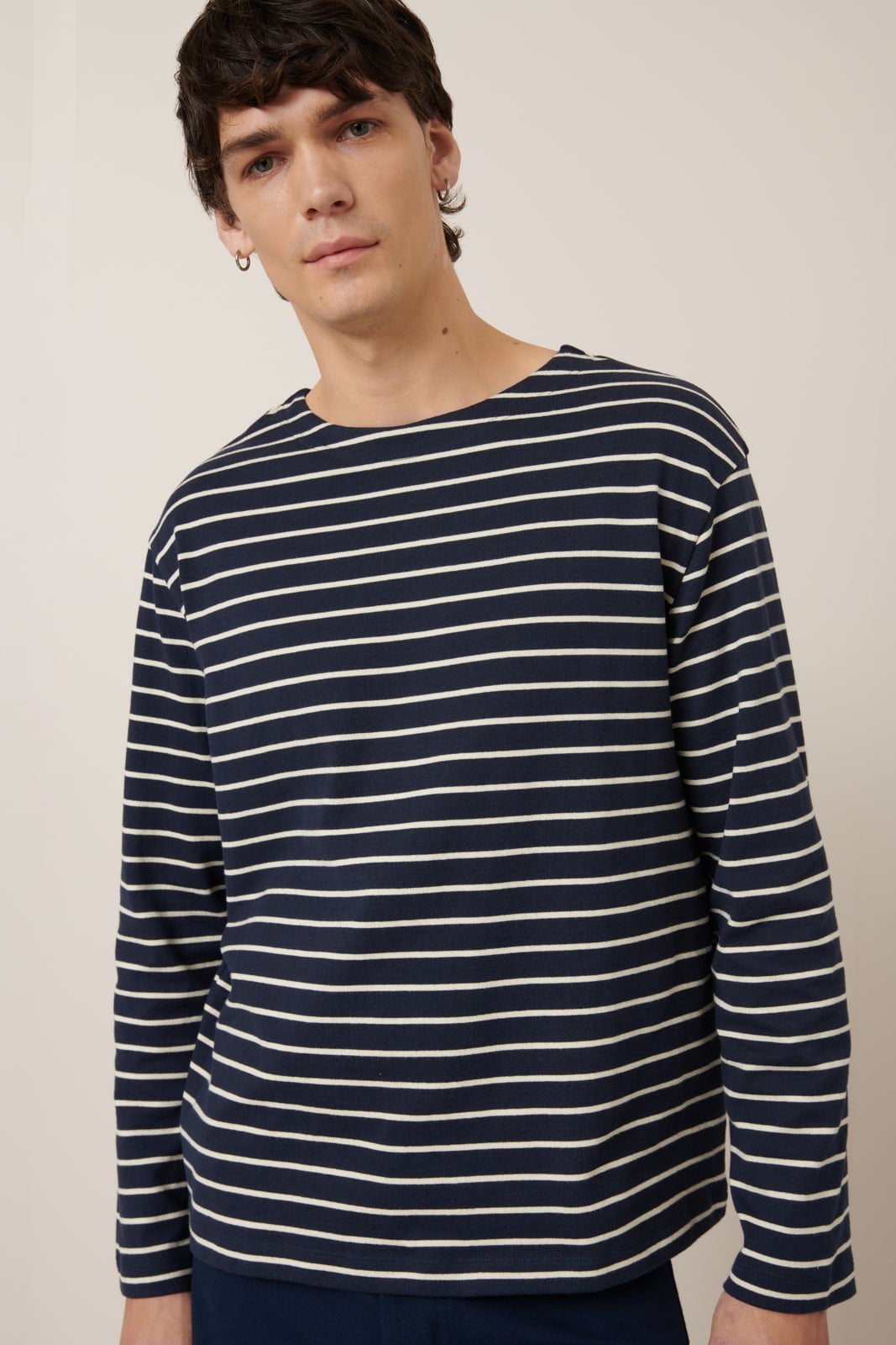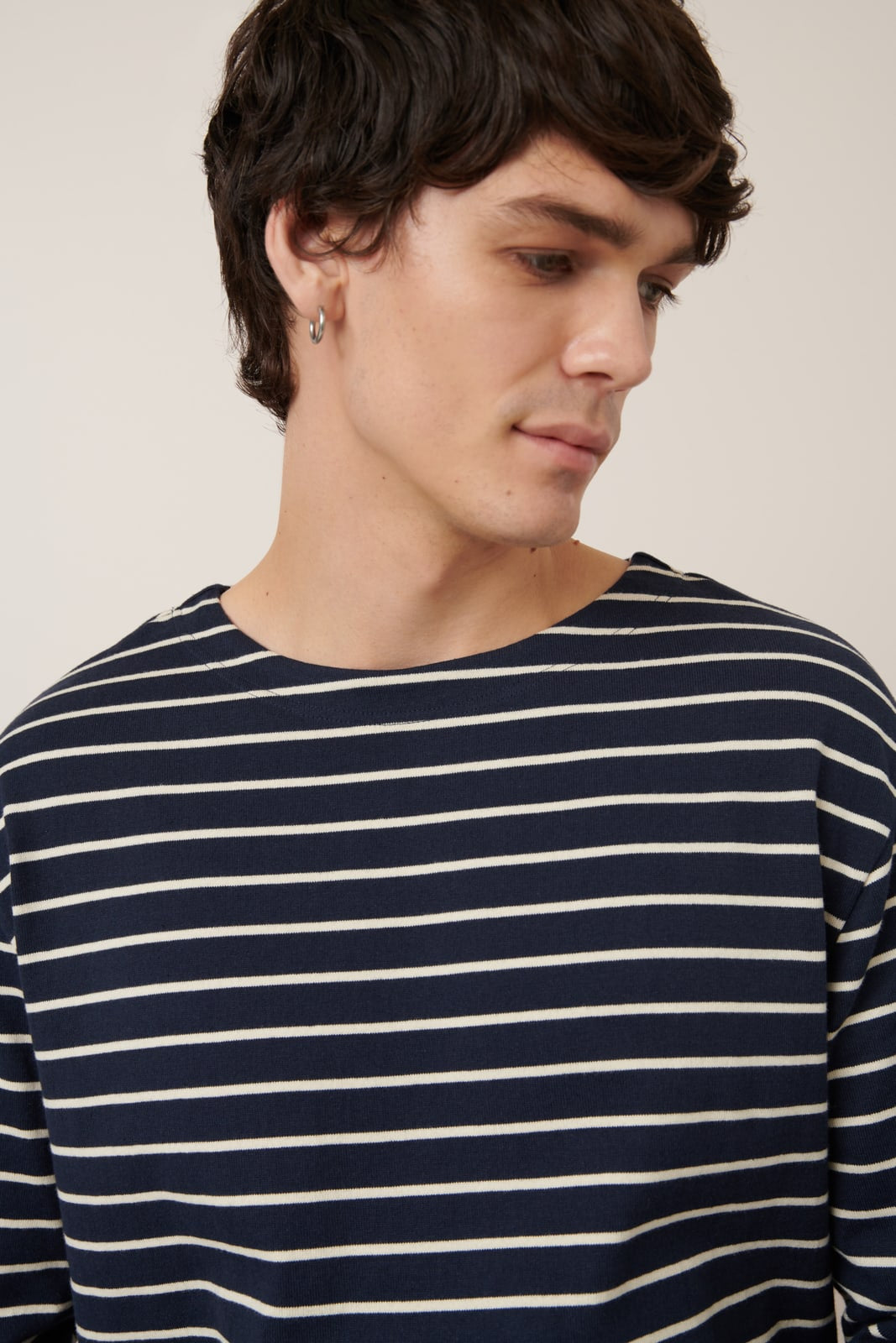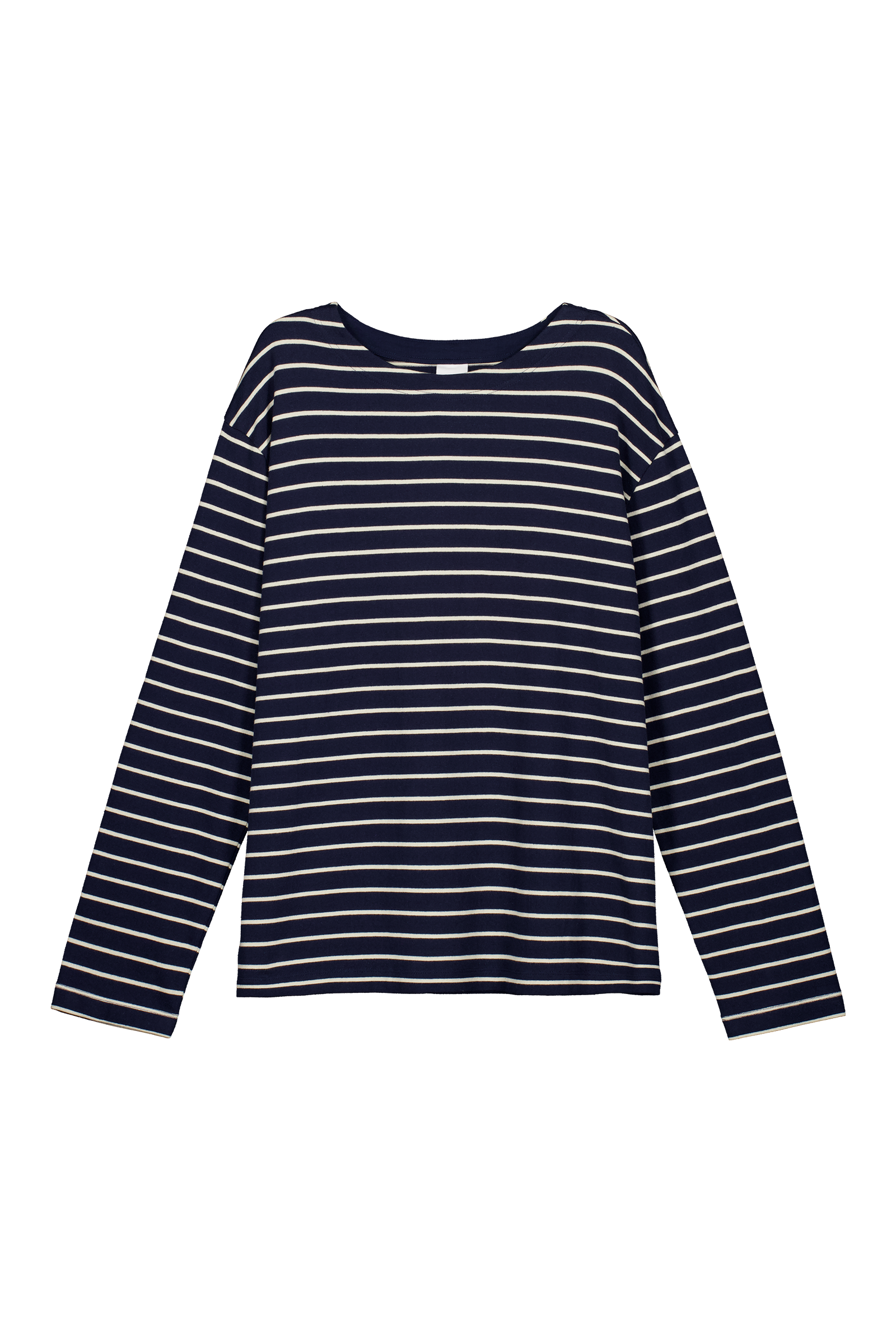 A classic, long sleeve top in a navy and greige stripe. A versatile piece that can be worn on its own or a light layer.
