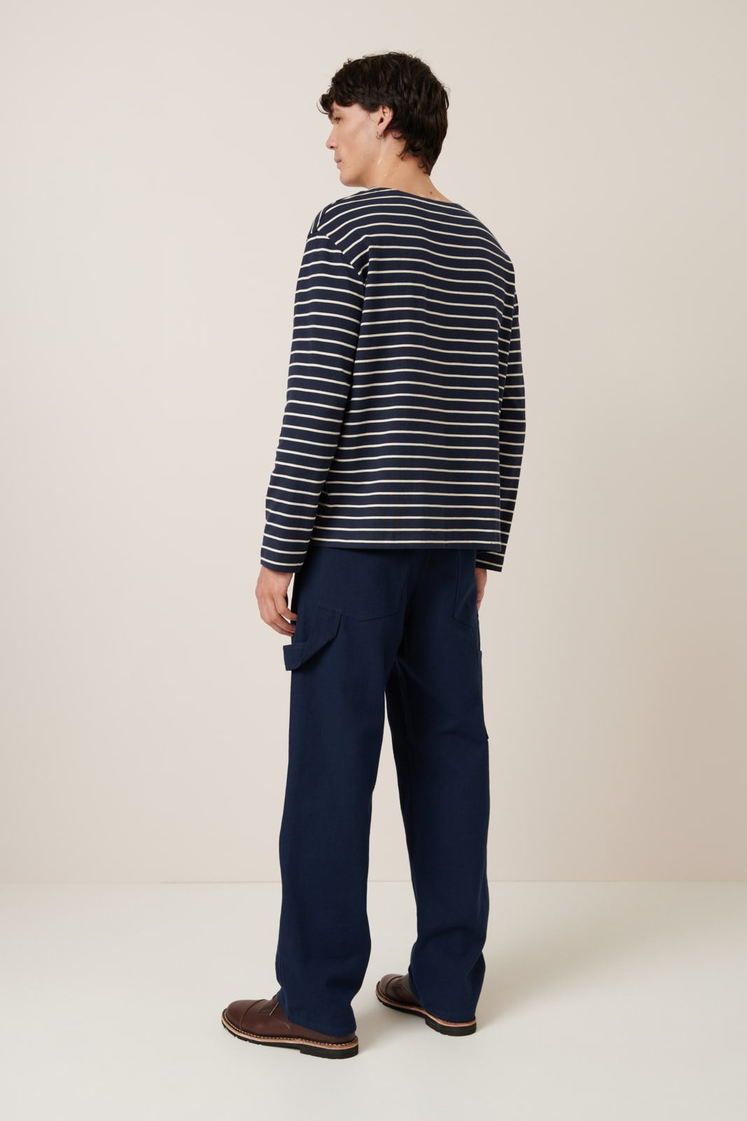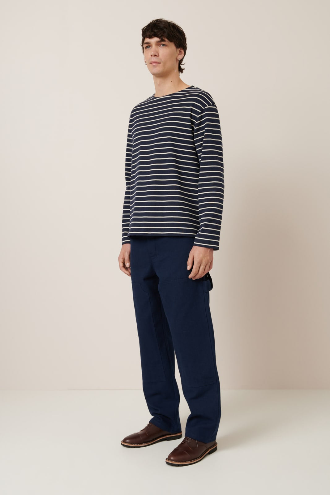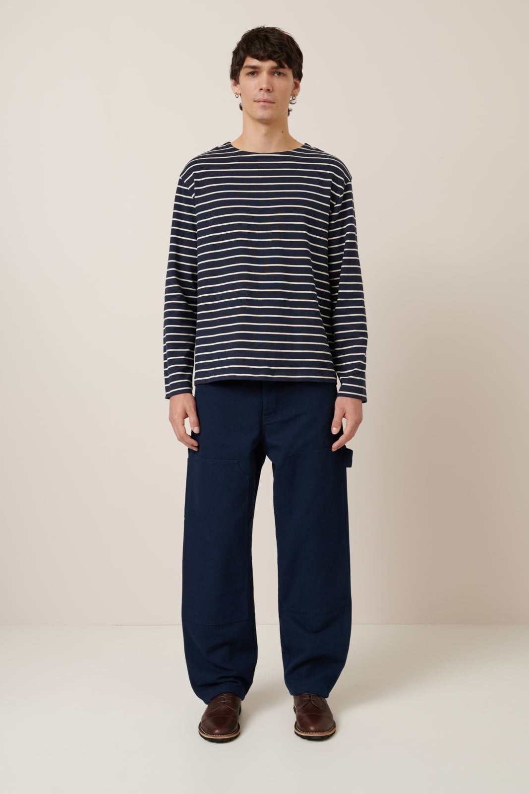 A classic, long sleeve top in a navy and greige stripe. A versatile piece that can be worn on its own or a light layer.