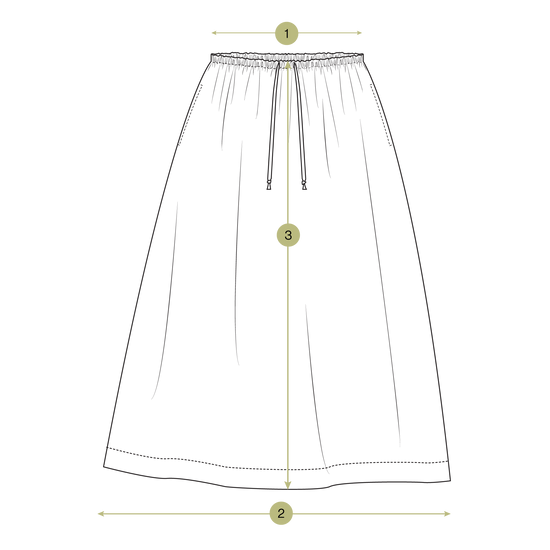 These individual product measurements have been taken from the garment pattern. The bust, waist, waistband, hip & hem measurements have been doubled to show the full circumference.