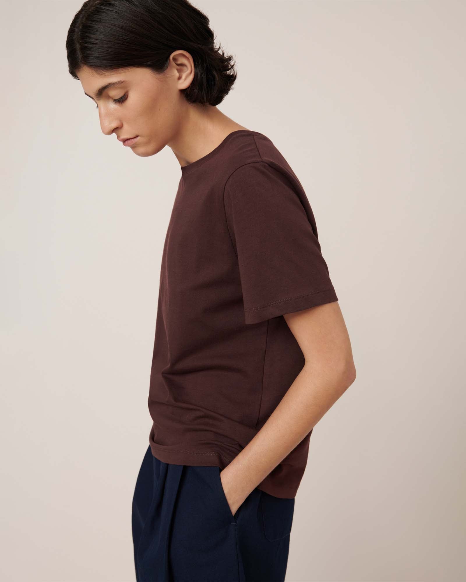 Our perfect everyday tee, the Classic Tee features short sleeves, a standard fit through the body and is finished with a ribbed crew neck. Crafted from a mid-weight organic cotton jersey in a deep Magohany colourway.