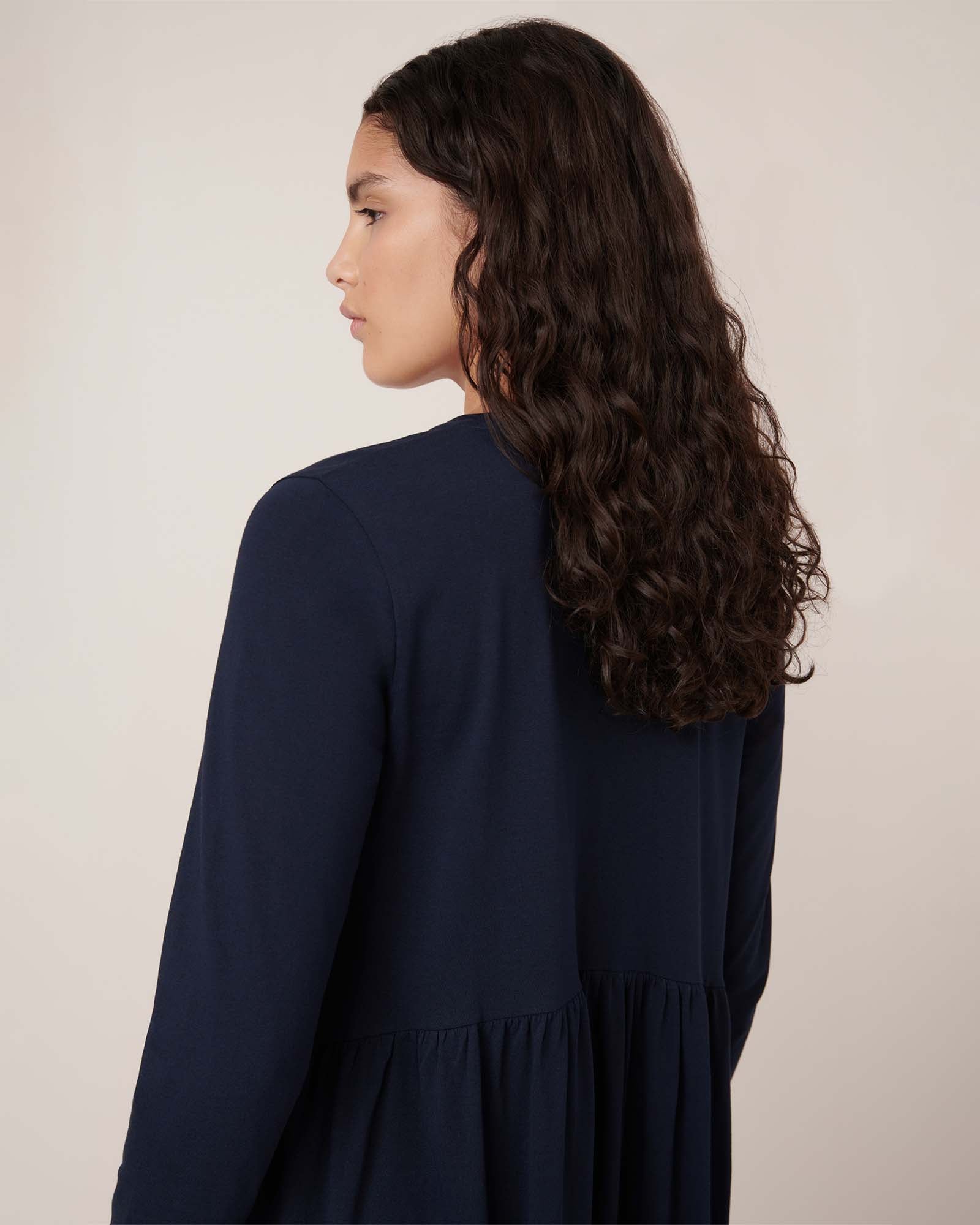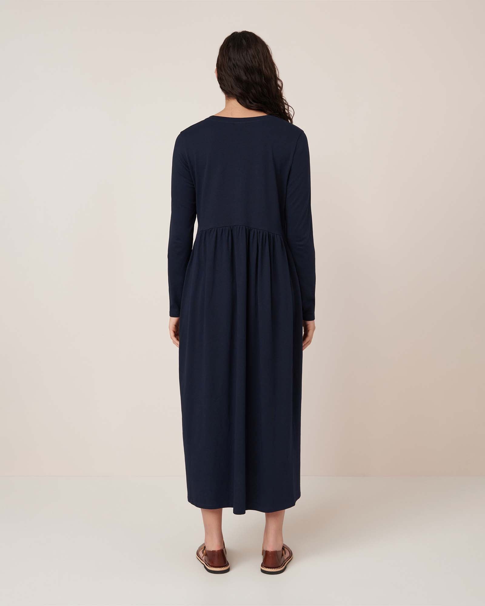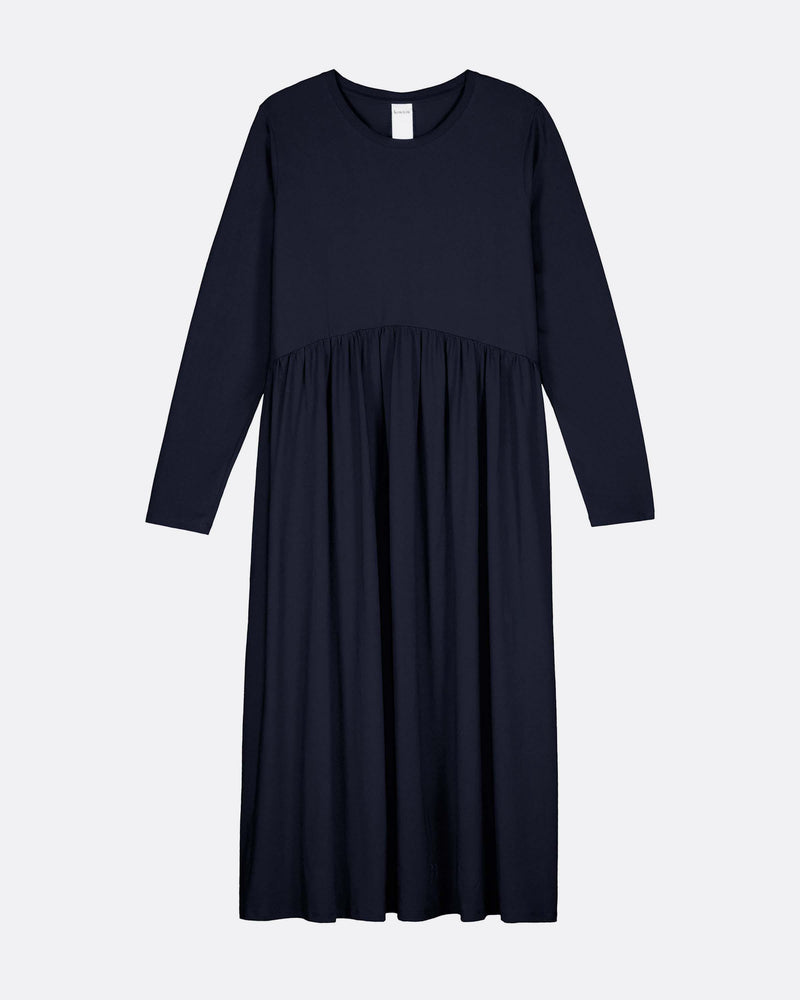 The Long Sleeve Gather Dress is a simple yet elegant dress, relaxed through the body with close-fitting long sleeves. It features a curved, gathered waist that adds fullness and is crafted from mid-weight organic cotton jersey.