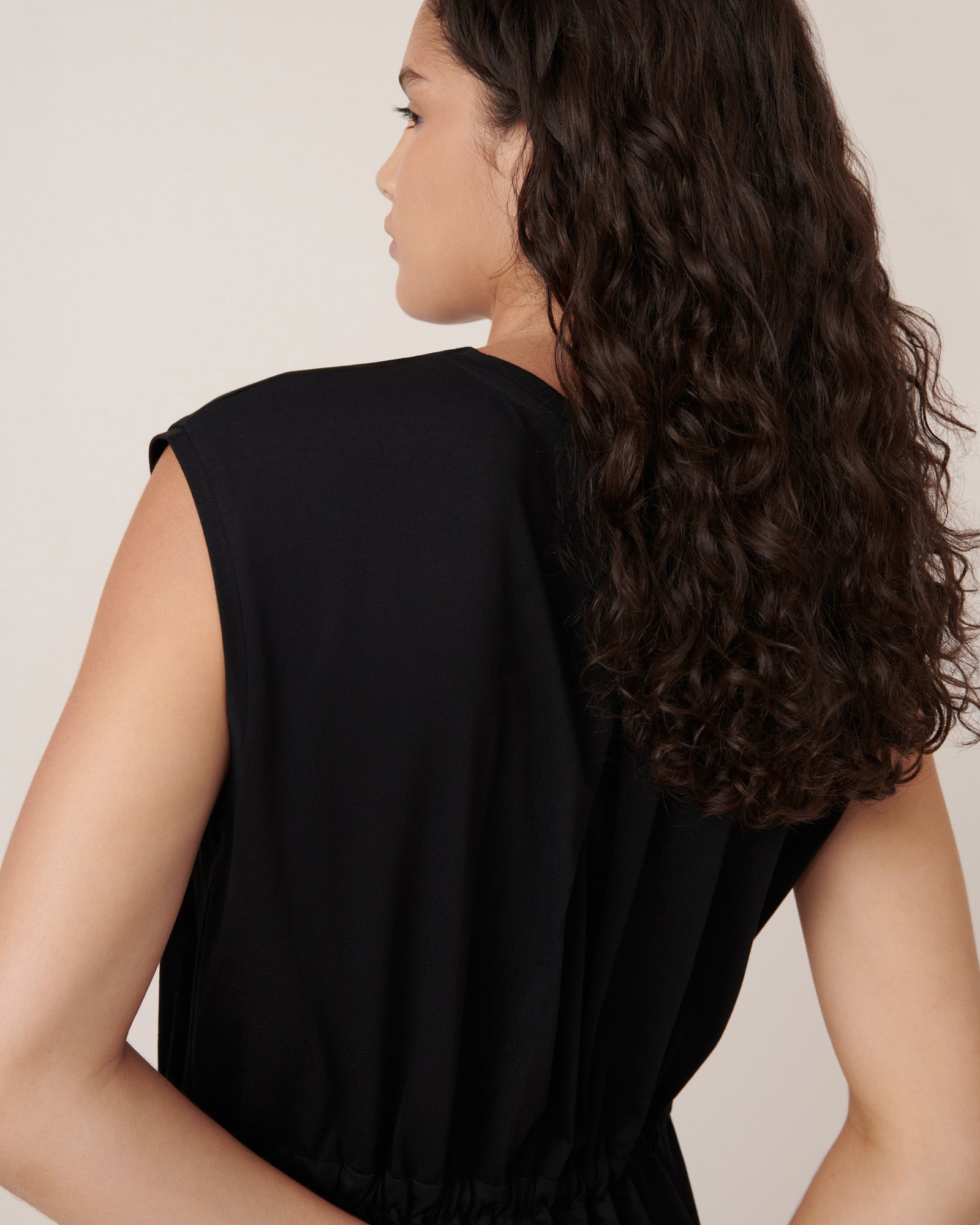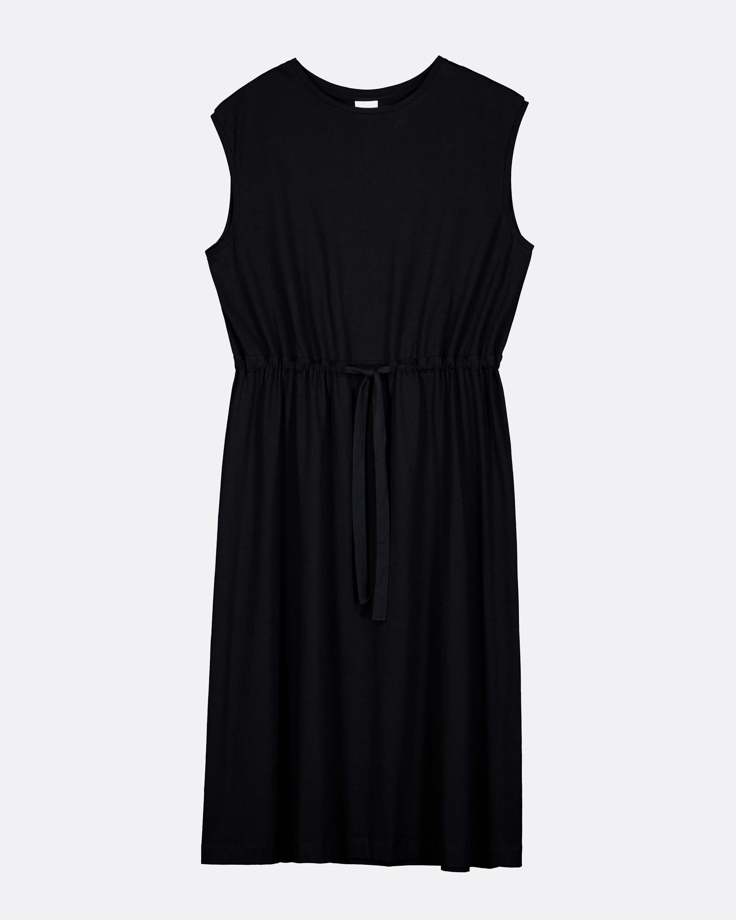 The Wave Dress draws inspiration from utilitarian design with a functional drawcord and a pleat at the back. It is midi-length, with an oversized fit and an exaggerated shoulder length that forms an elegant cap sleeve. Made from soft mid-weight organic cotton jersey.