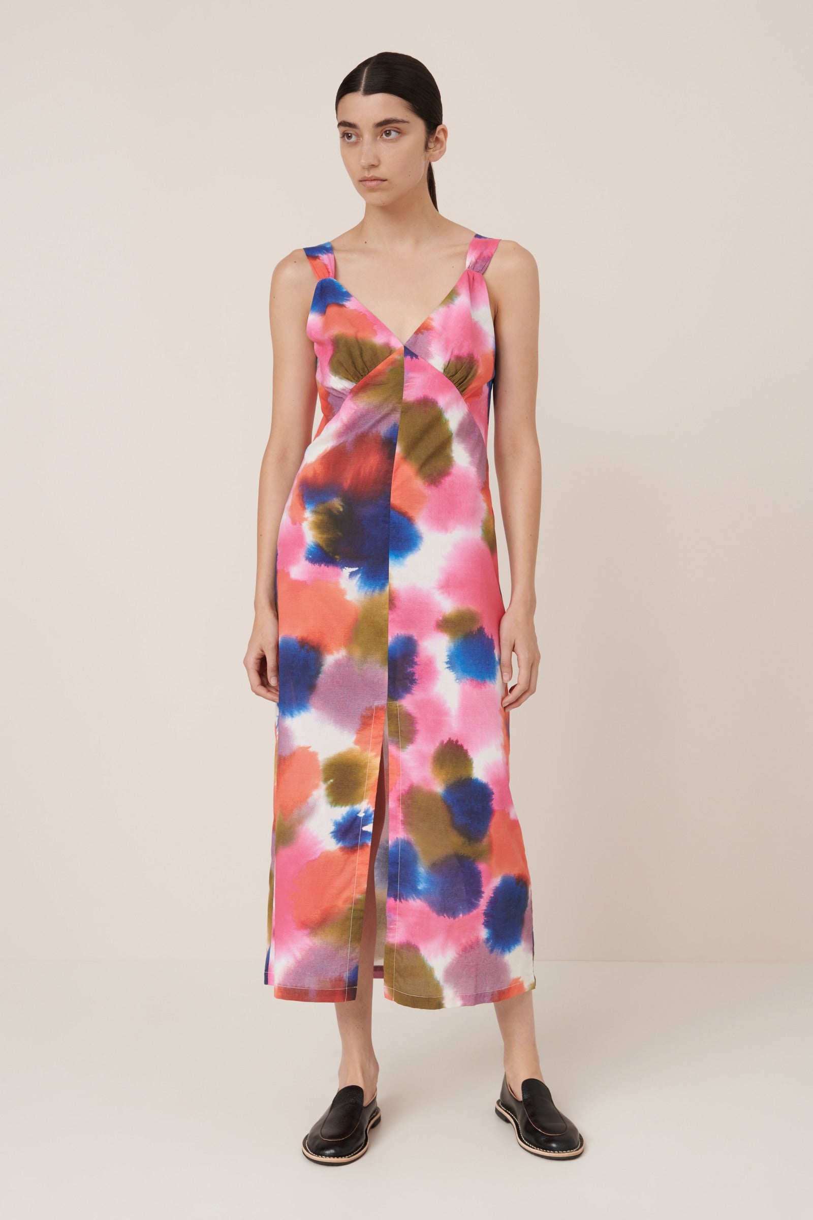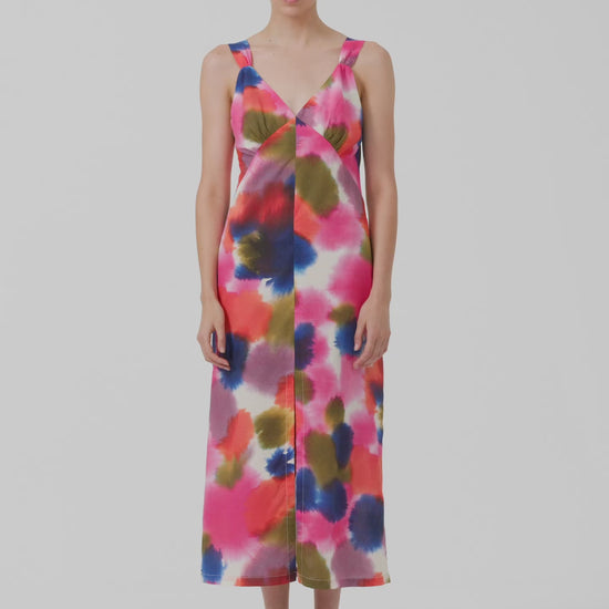 The Fluidity Dress embodies elegance with a beautifully cut, fitted silhouette, featuring a flattering v-neckline and midi-length hem. Made from soft organic cotton voile, this dress showcases our hand-painted watercolour print. Designed with a standard fit, it includes a front split for added ease and movement. A perfect occasion-wear style.
