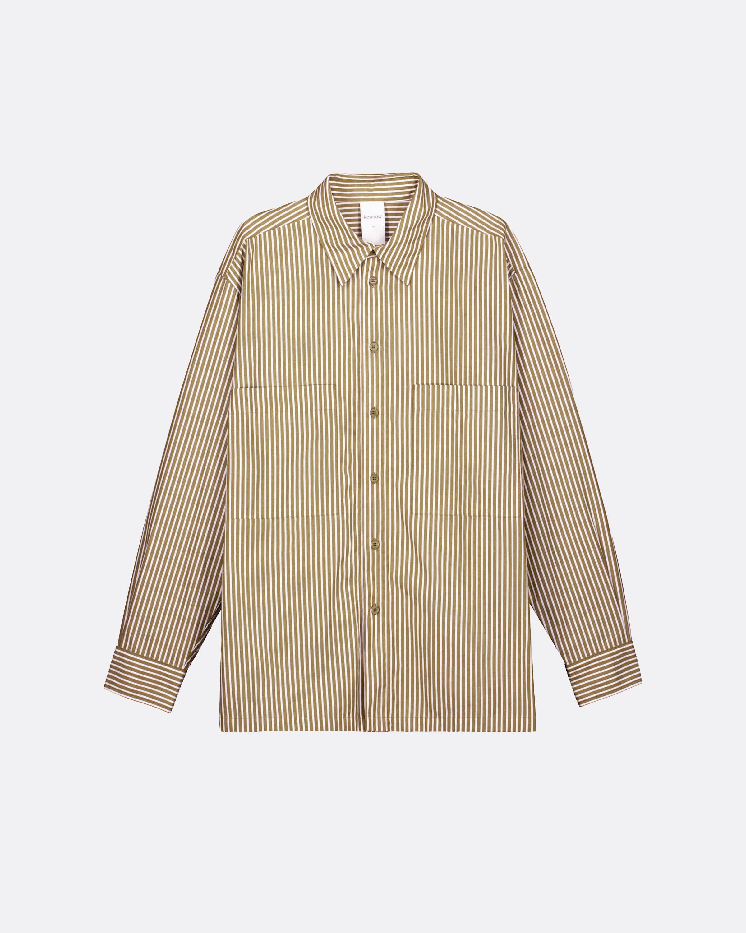 The Henry Shirt is crafted from a crisp organic cotton poplin in a classic stripe and features a relaxed, boxy fit. The shirt is cut with a straight hem and small side splits, with a back hem that's slightly longer for added interest. Oversized patch pockets and a large back yoke give it a utilitarian touch. Designed to be worn relaxed and untucked, it fastens with a nut buttons at the placket and cuffs for a refined finish.