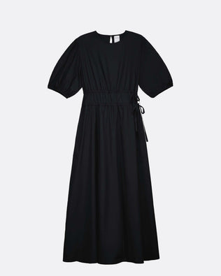 A statement dress, made from a lightweight organic cotton voile. The Long Celeste Dress is a full-length style with a relaxed fit. It has a fitted shoulder and short balloon sleeves, and features a double drawcord waist detail for texture and customisable wear. Fastens at the back with an Agoya shell button. An elegant dress for day and evening alike.