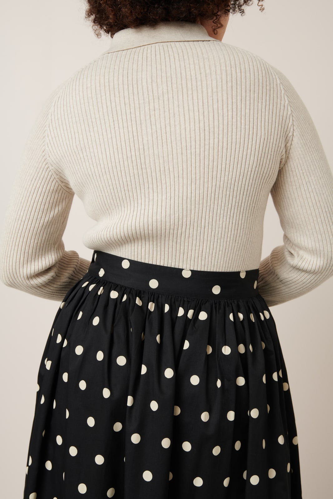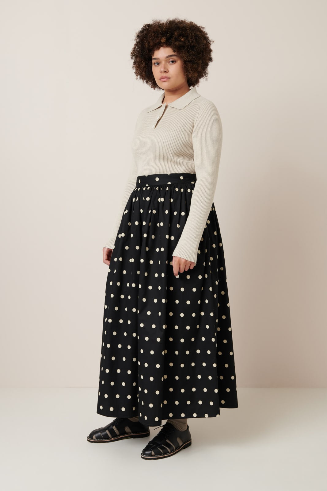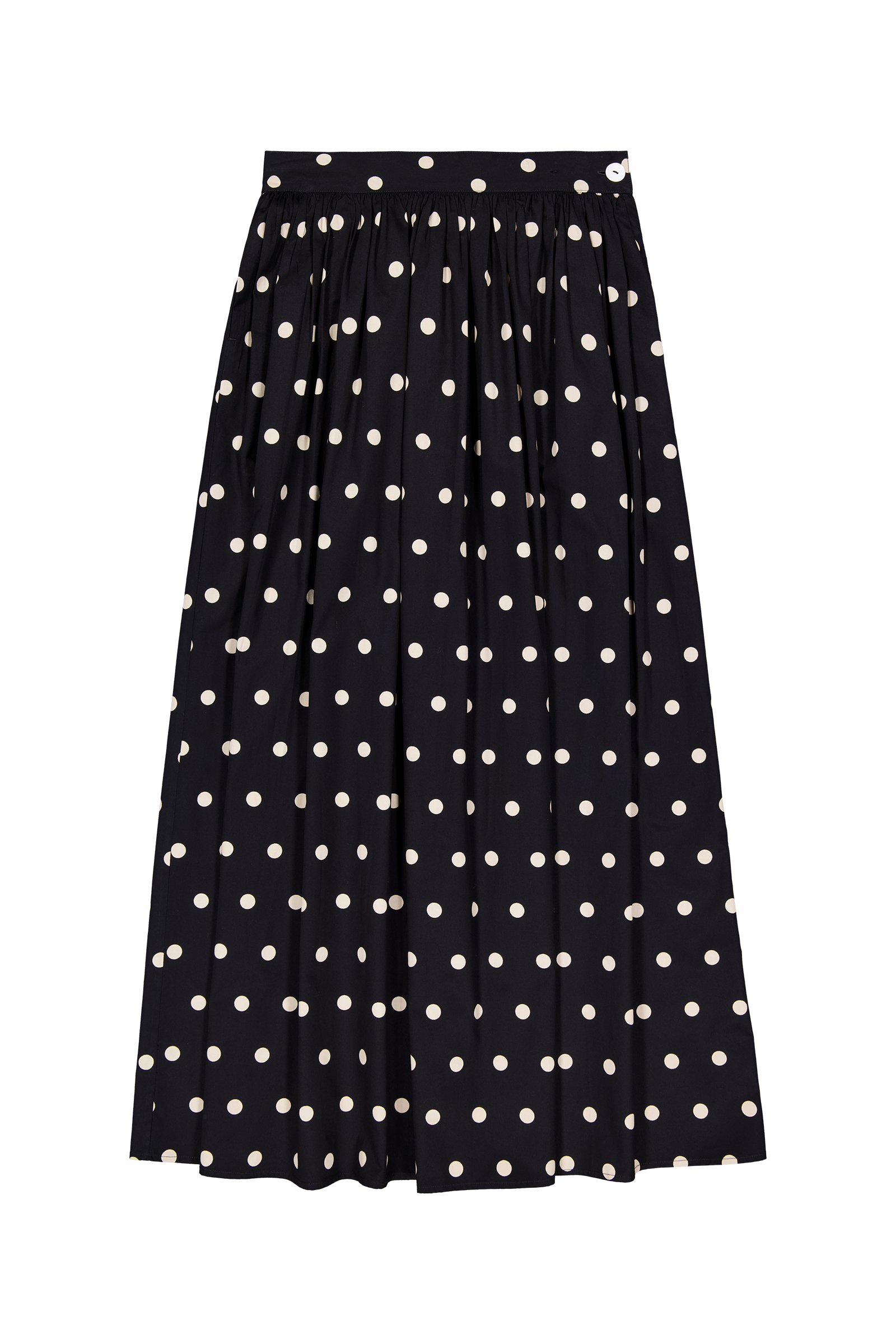 A flared skirt with full gathers through the waist, pockets and a fixed waistband with a shell button closure. The Luna Skirt features a playful polka dot, printed on lightweight organic cotton twill. The skirt is a standard fit and finishes at ankle length.
