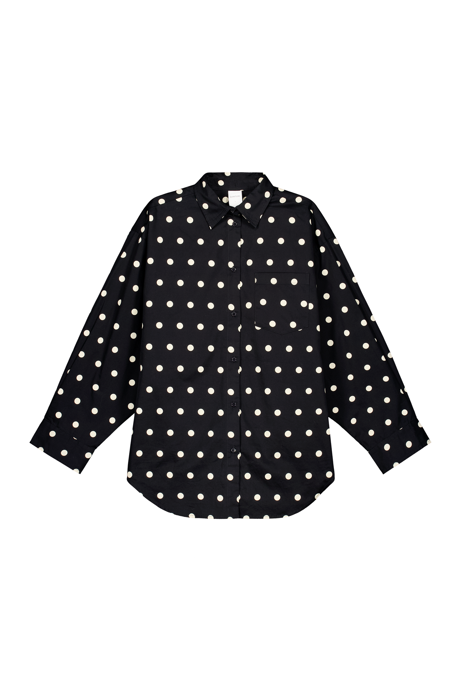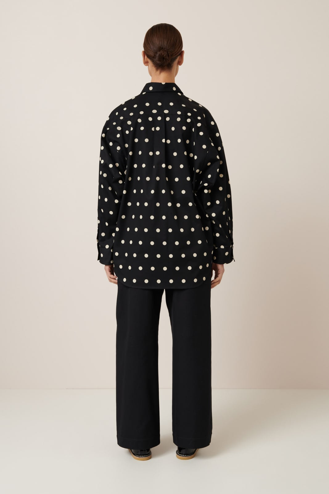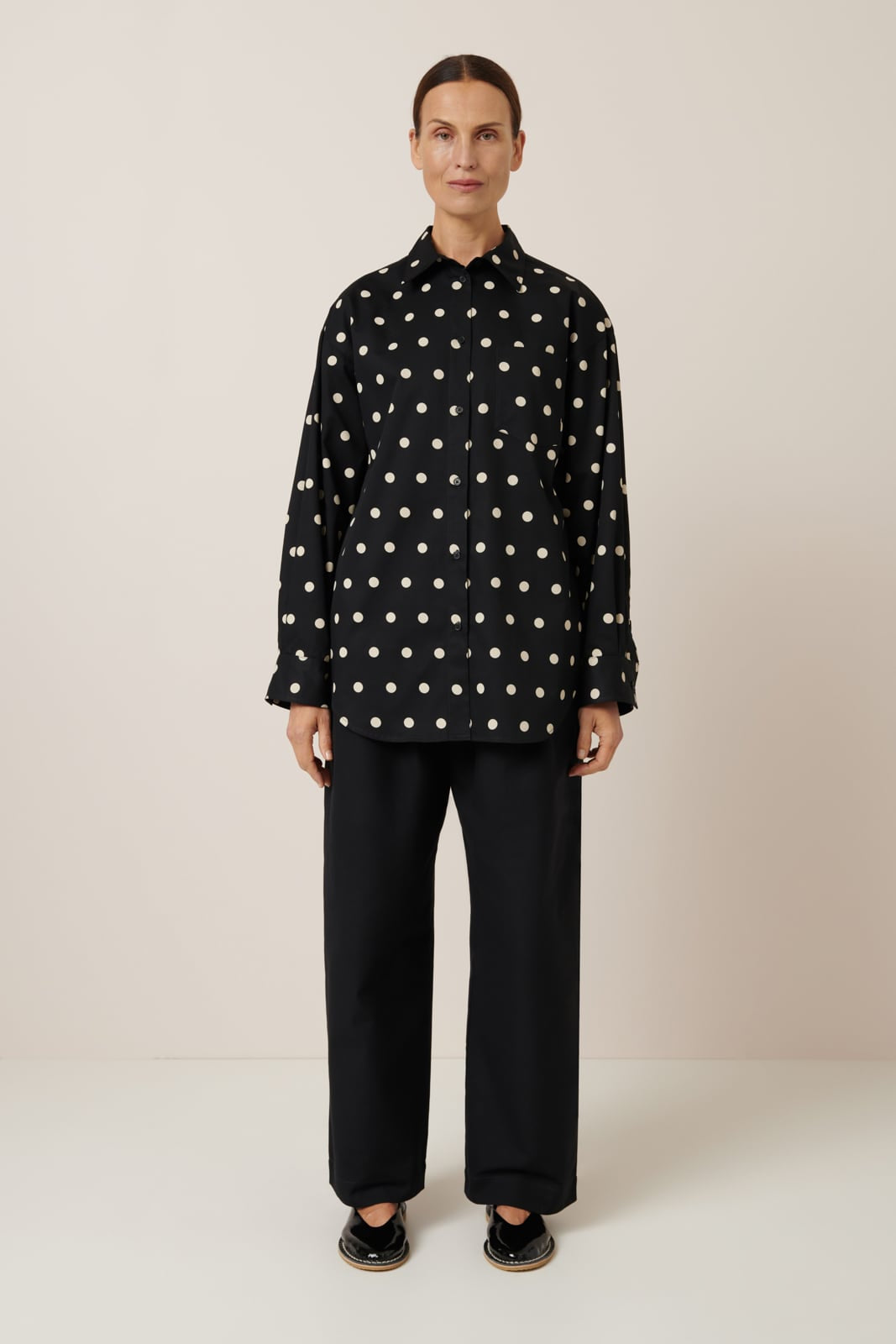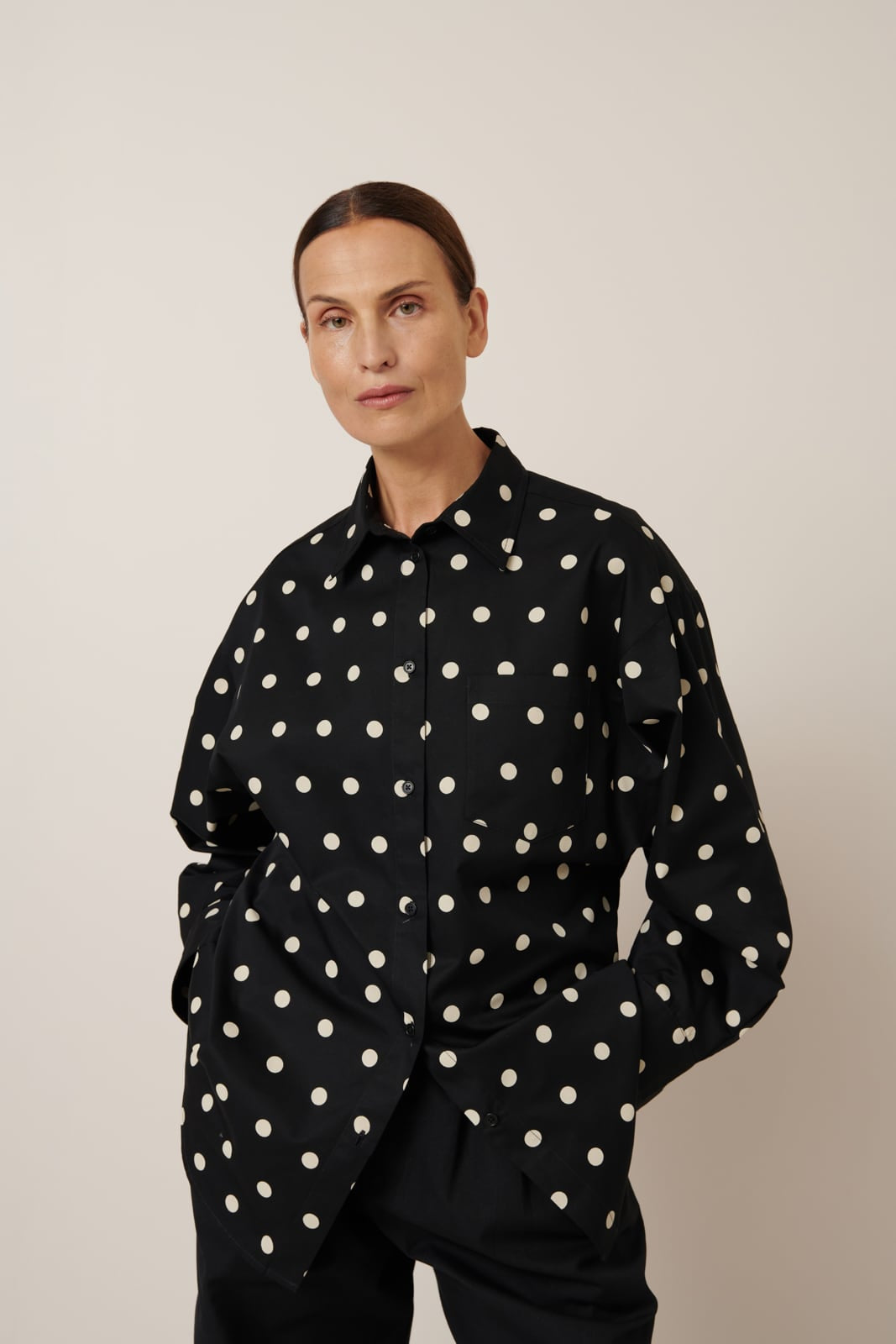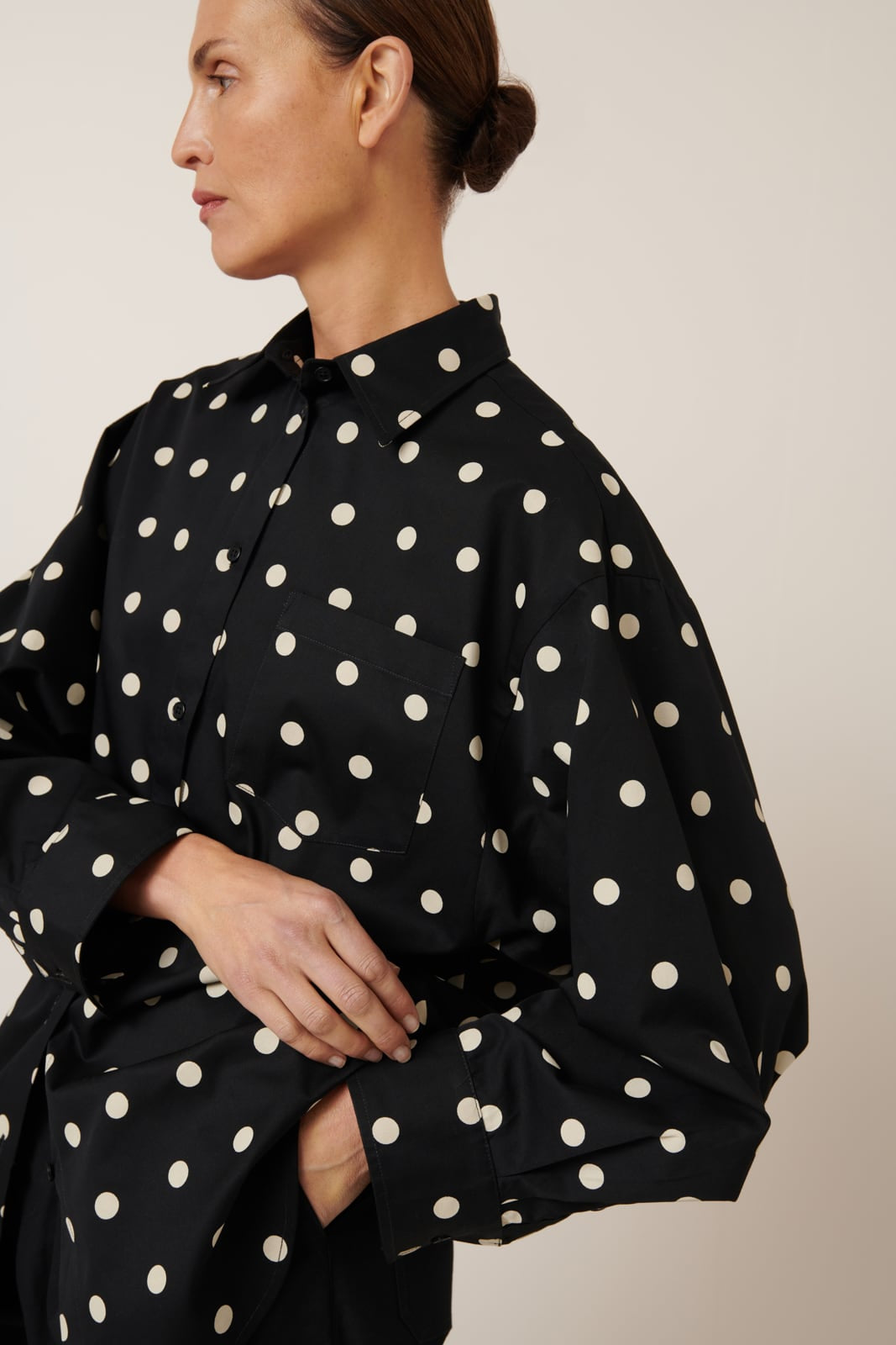 An oversized fit shirt with a drop shoulder and exaggerated batwing sleeve. The Nova Shirt has a classic shirt collar, wide cuffs and an Agoya shell button closure through the front. Featuring a playful polka dot printed onto organic cotton twill.