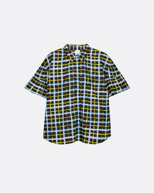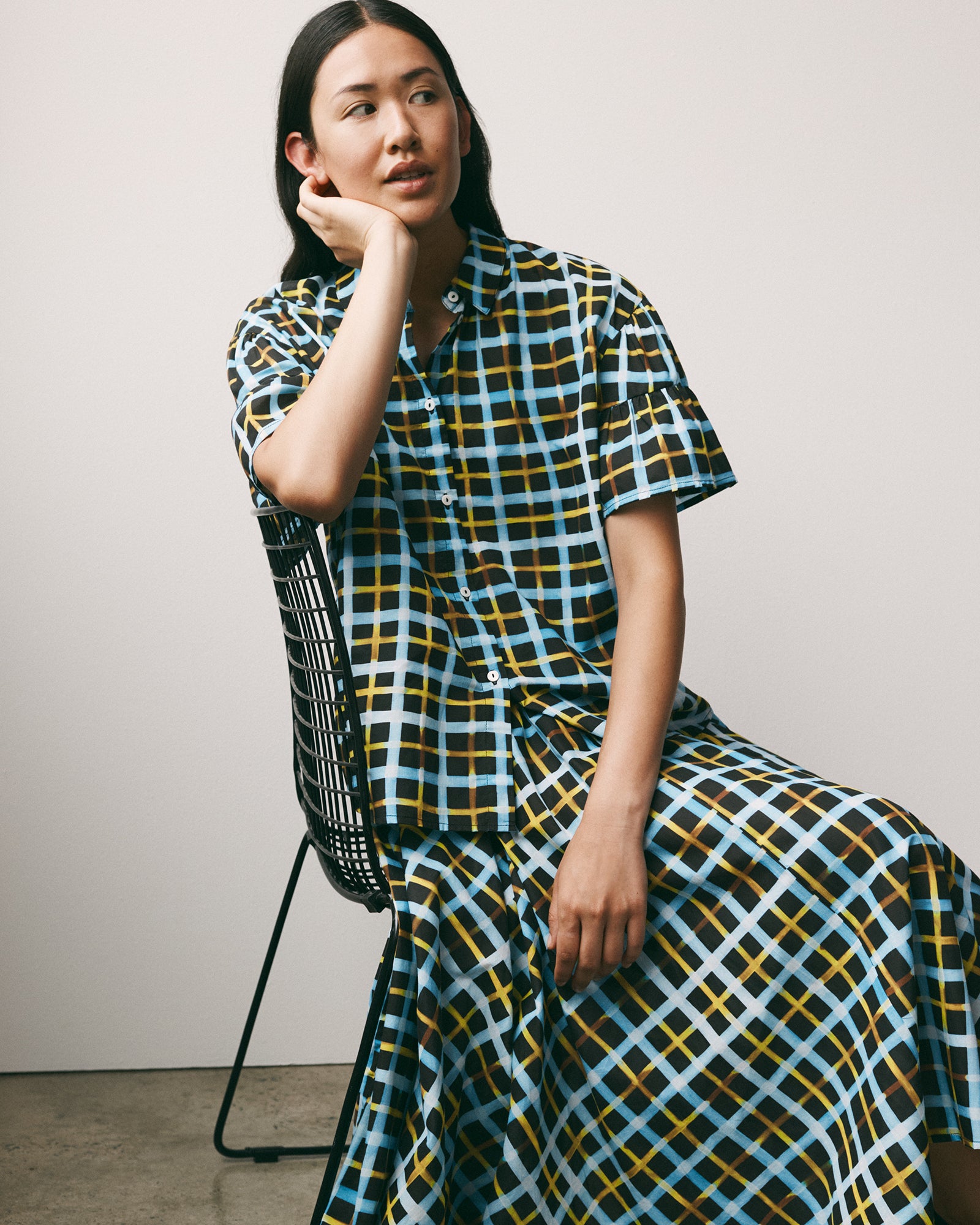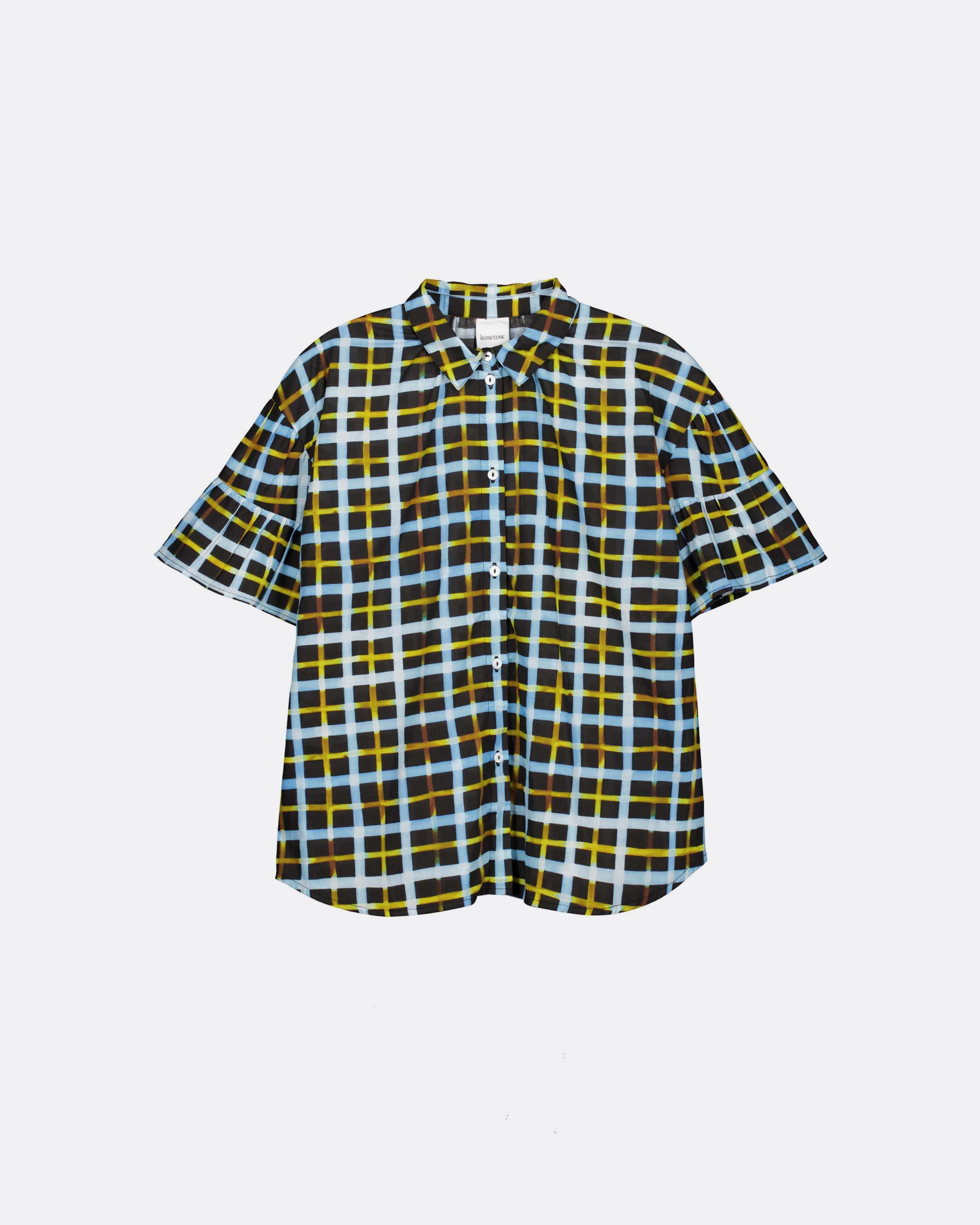 The Painterly Blouse is an oversized fit shirt featuring frill sleeve and shell button placket. Crafted from light-weight organic cotton voile in our Neon tartan print — a hand painted design with bold brushstrokes and vibrant pops of yellow.