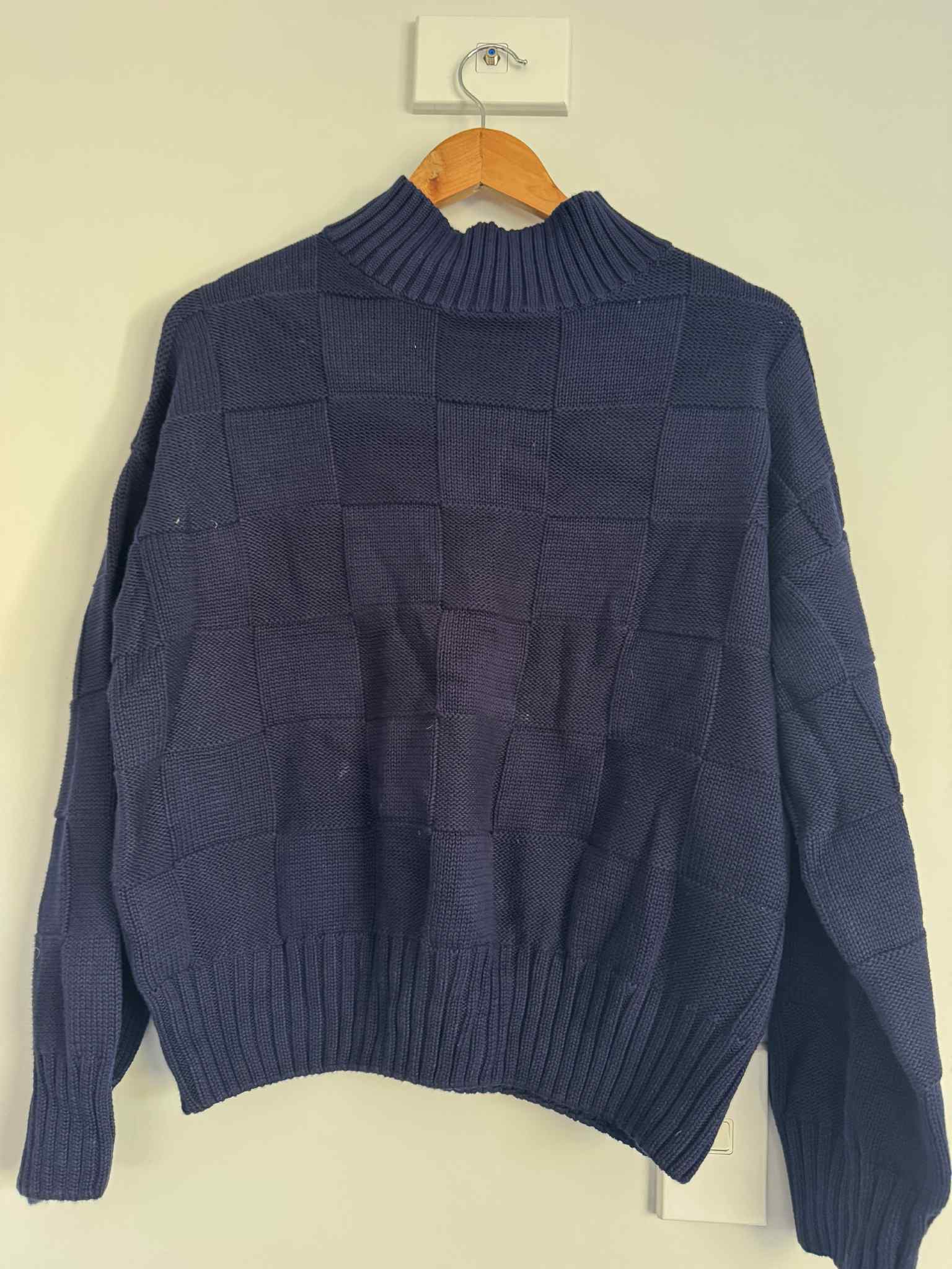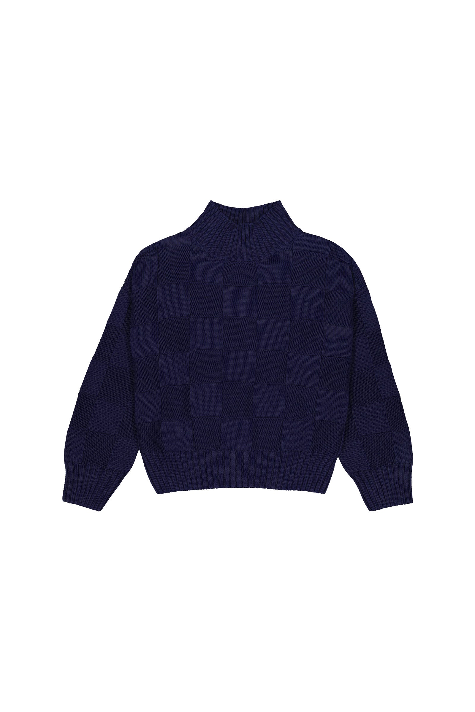 A high neck jumper, knitted in a textural basket weave. The Basket Jumper has a drop shoulder and is finished with contrast rib at the neck, cuff and hem.