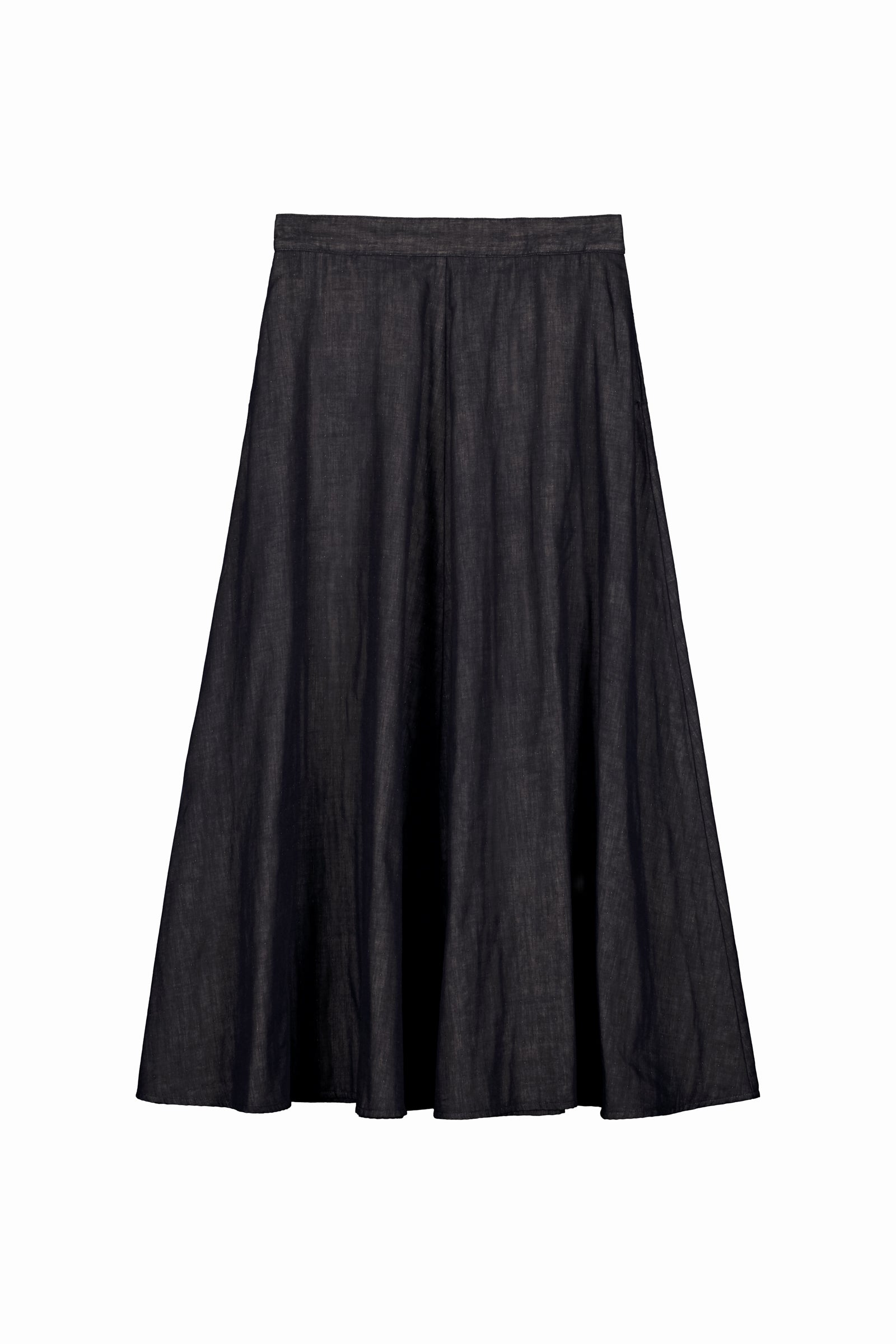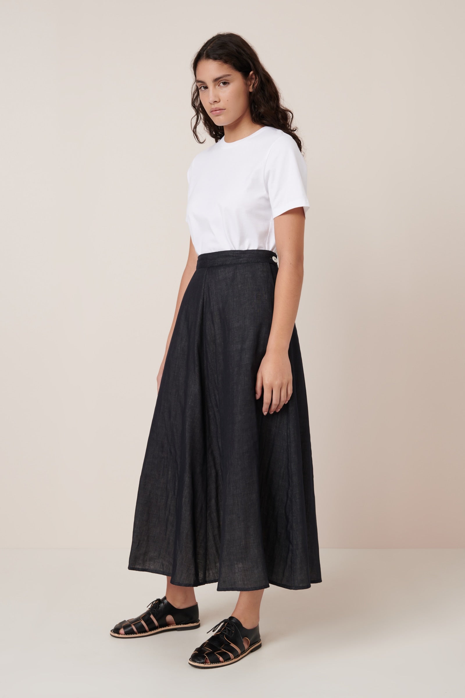 The Rotation skirt offers a classic a-line silhouette, crafted from soft organic cotton double cloth for a refined yet comfortable feel. Designed with a fitted waistband with a nut button closer and practical side seam pockets. With a standard fit that falls to ankle length, this versatile peice pairs effortlessly with any wardrobe staple.