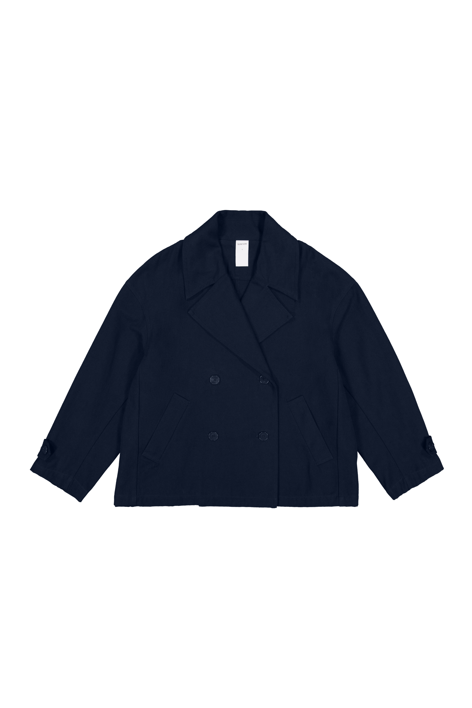 The Silhouette Jacket has a very oversized, boxy fit and is made in a heavyweight organic cotton canvas. Inspired by a traditional pea coat, it is double breasted with a lapel collar and fastens through the front with Tagua nut buttons. It has angled front pockets and finishes at hip length.