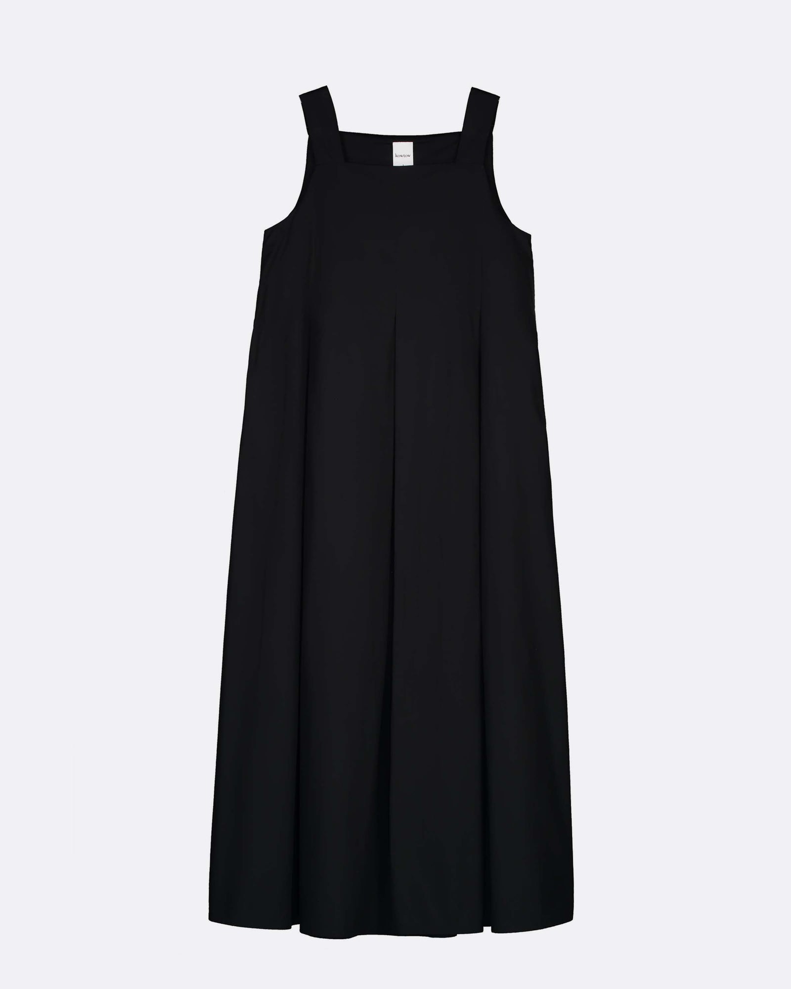 A slip-on silhouette with a high square neckline and wide shoulder straps. With a standard fit through the bust, it falls to a full-length pleated skirt with side seam pockets. Layer it in the colder months or wear it by itself in the warmer.