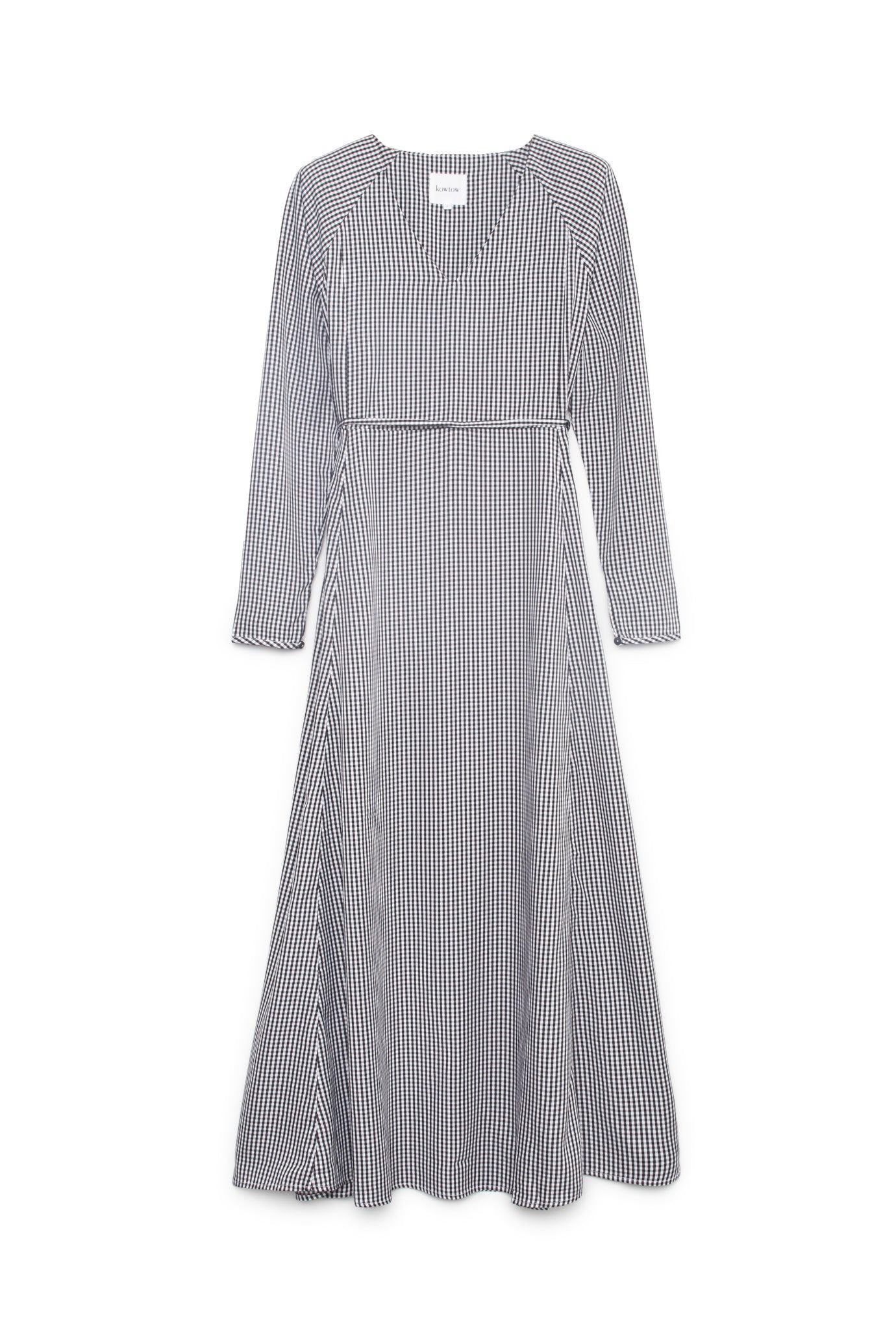 A long v-neck dress with an a-line skirt, made from a smooth tencel twill. The dress has raglan sleeves and a tie waist.